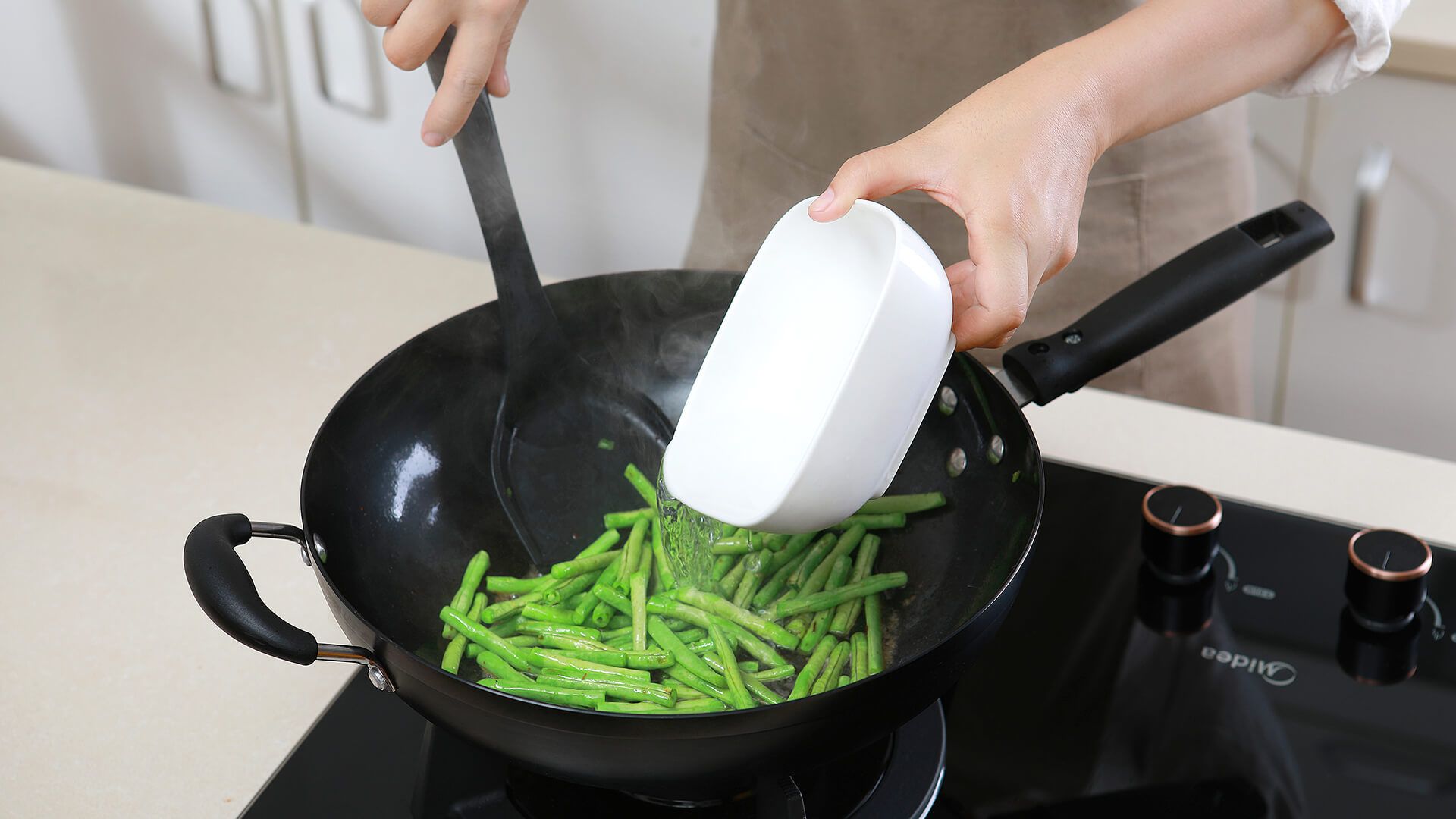 留下炒肉的底油放入豇豆炒至断生,接着填入半小碗清水,炖至软烂,放少许的精盐,十三香调味。