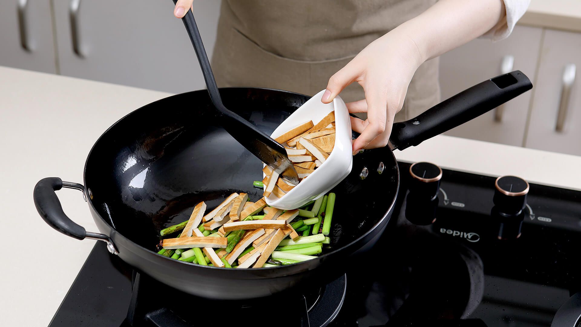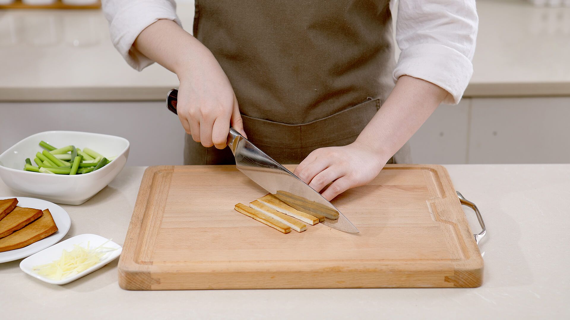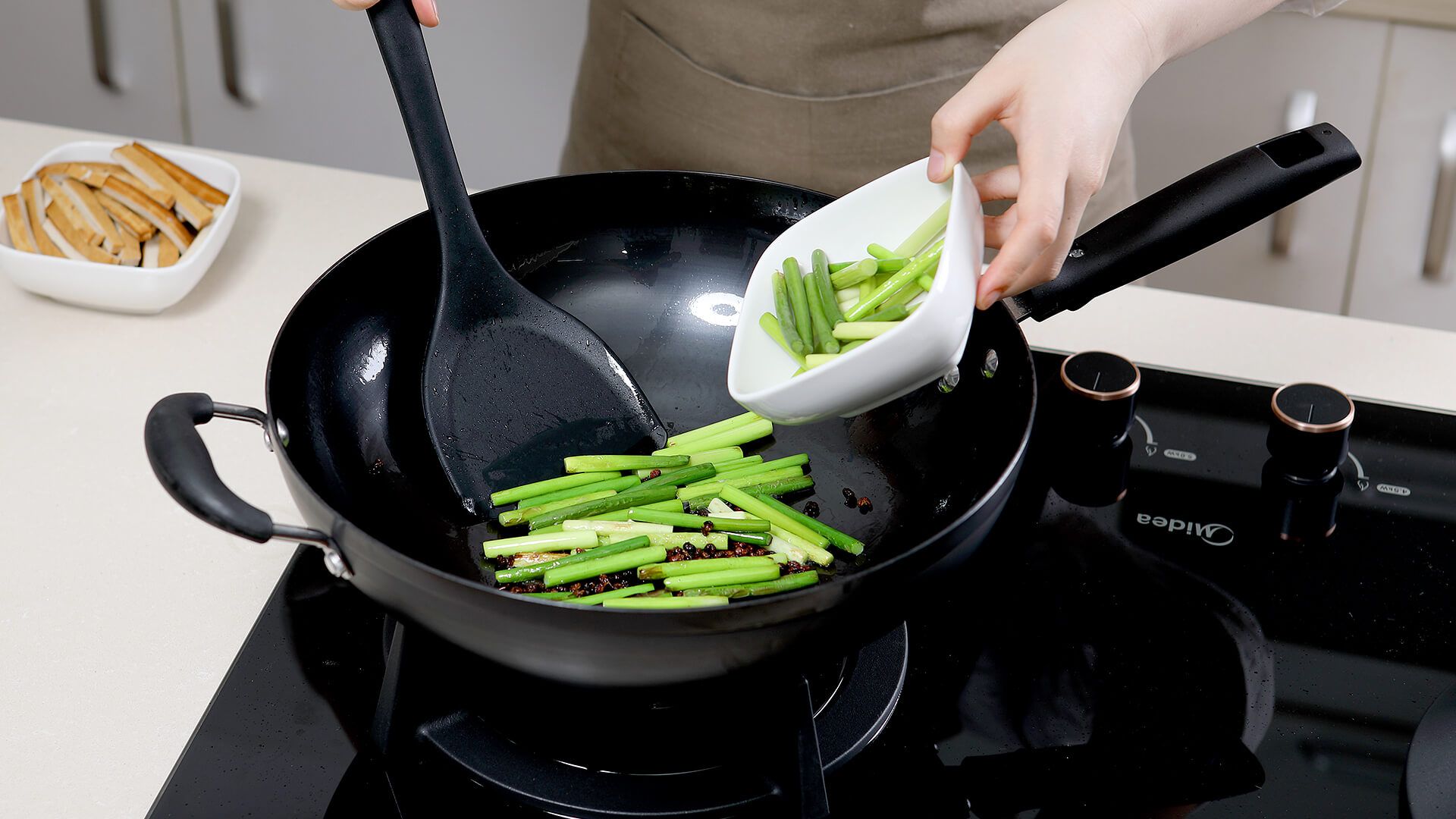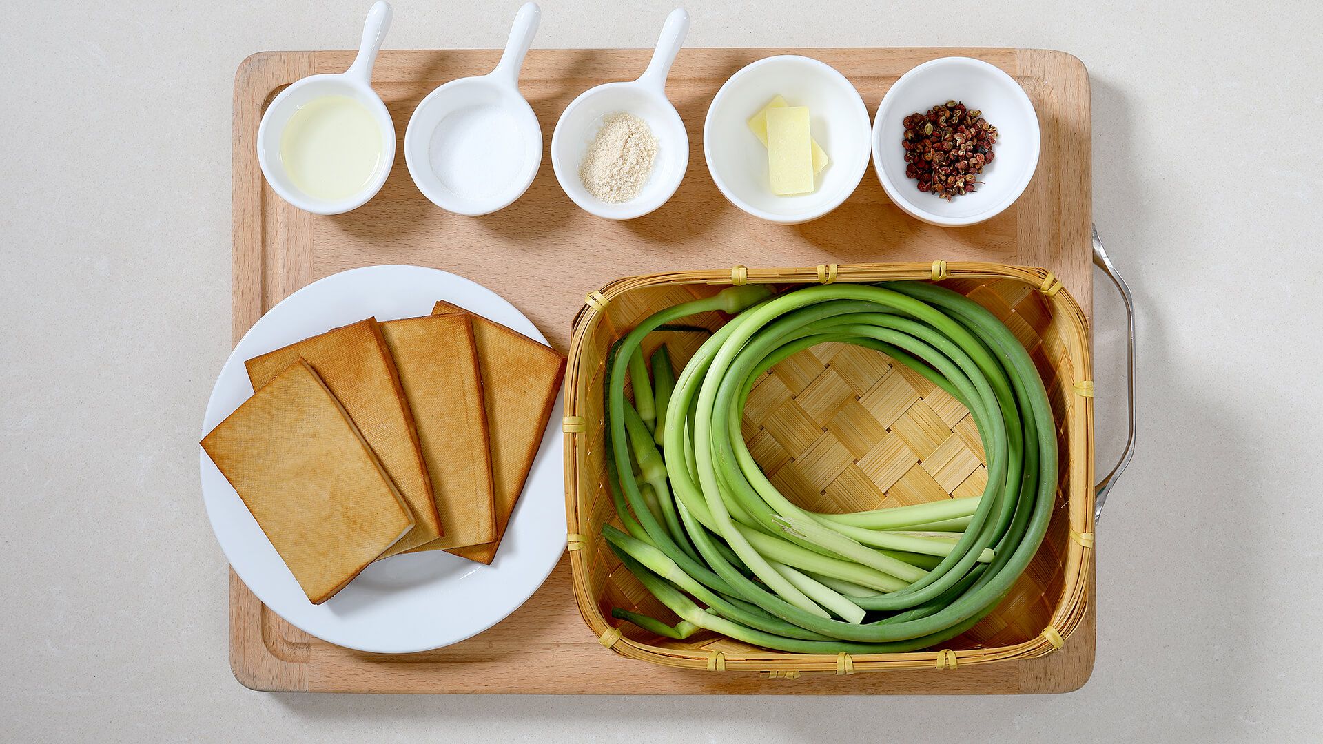 蒜苔清洗干净切成段,豆腐干切条,姜切丝备用。