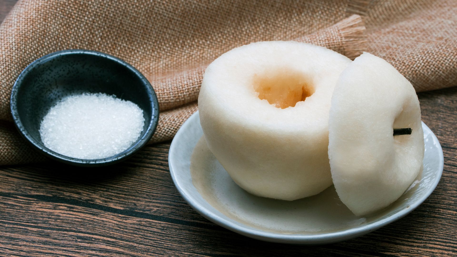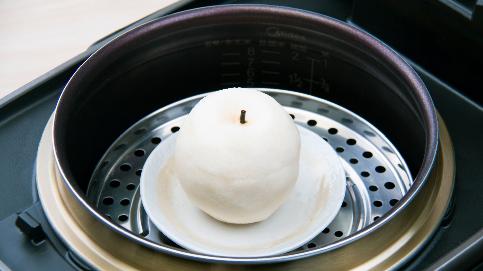 摆入弄好的水梨。再灌满开水。