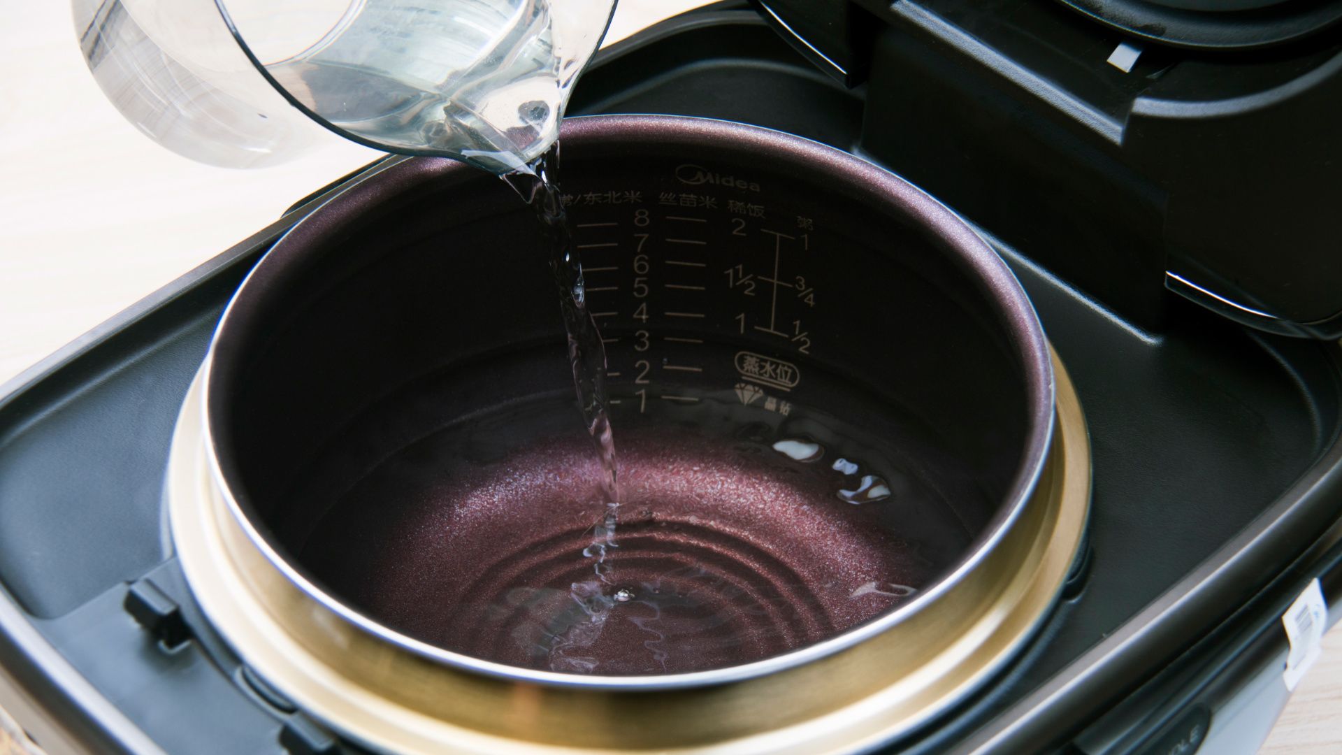 饭煲内锅放入清水至煮饭2刻度水位。