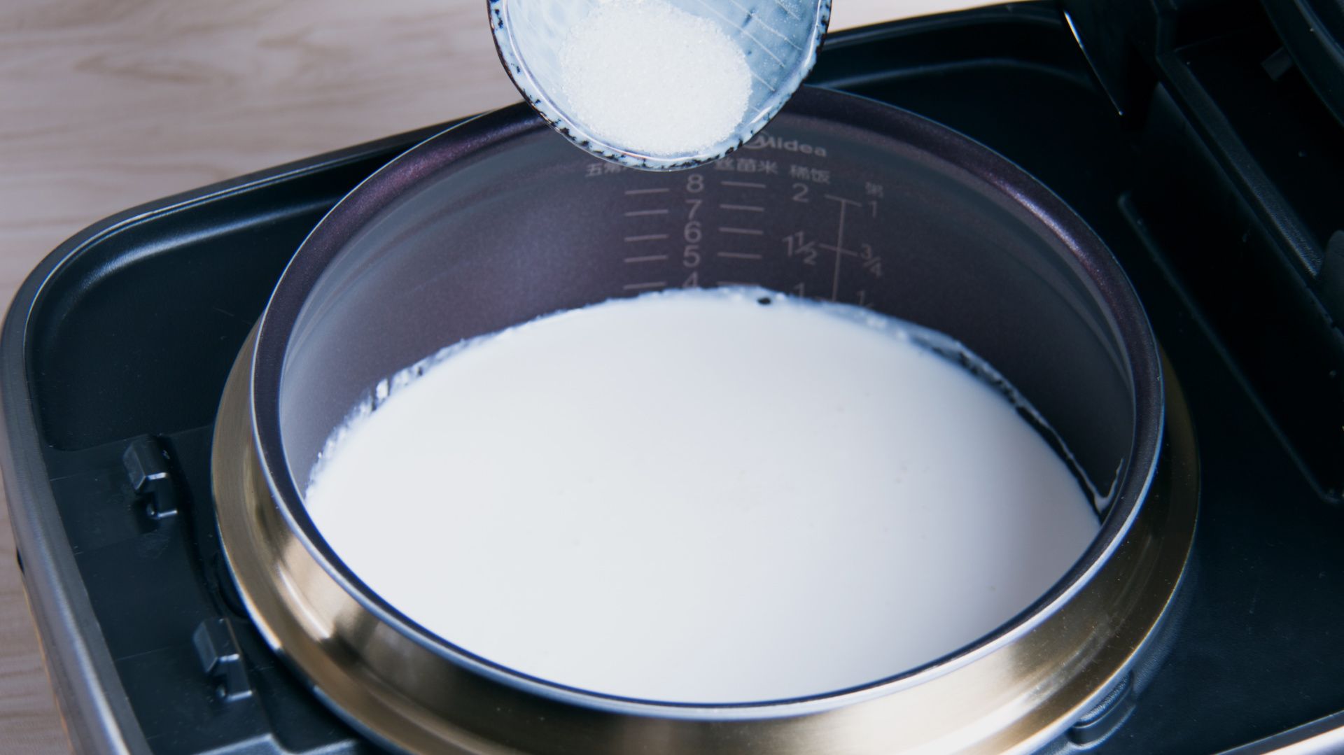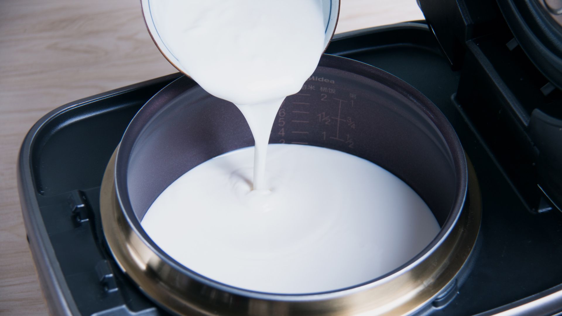 将内胆清洁干净、擦干水份,依次倒入纯牛奶和原味酸奶。