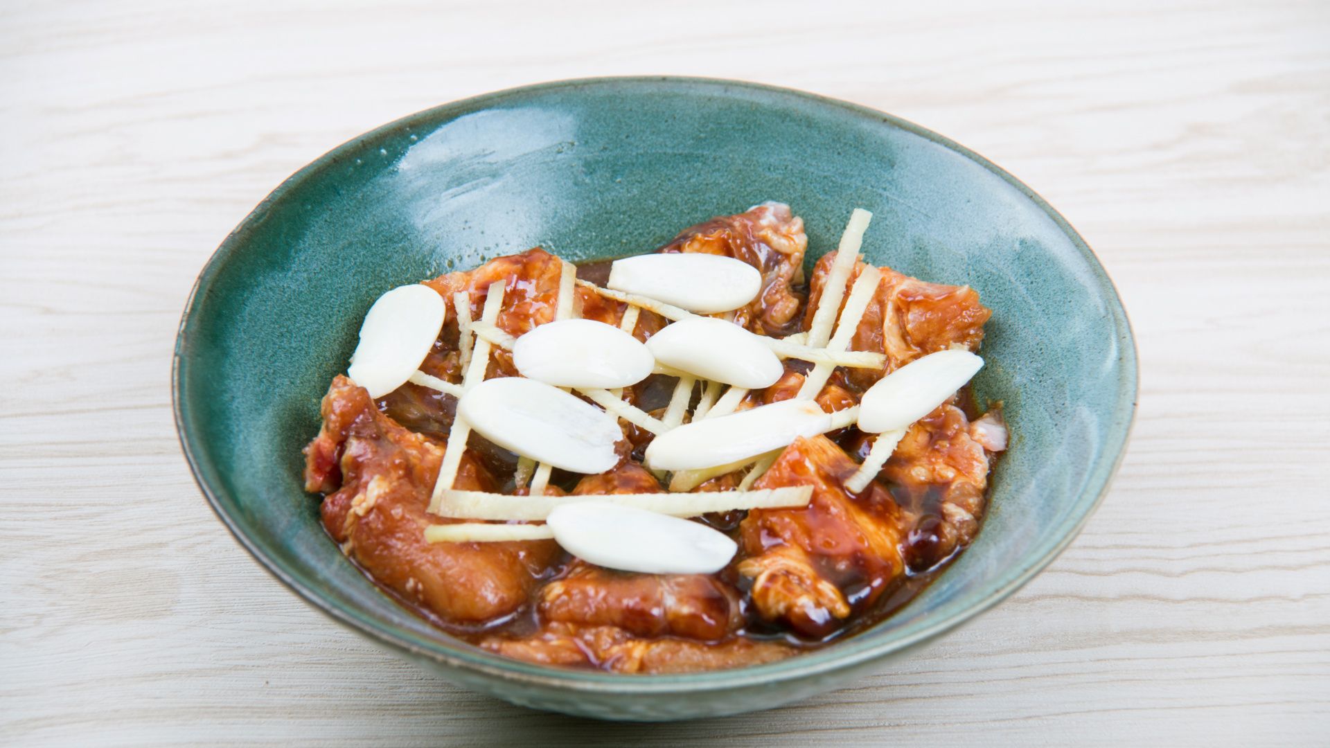 排骨装入容器内同时加入生粉、白砂糖、酱油、柱候酱、盐、蒜头、姜搅拌均腌制待用。