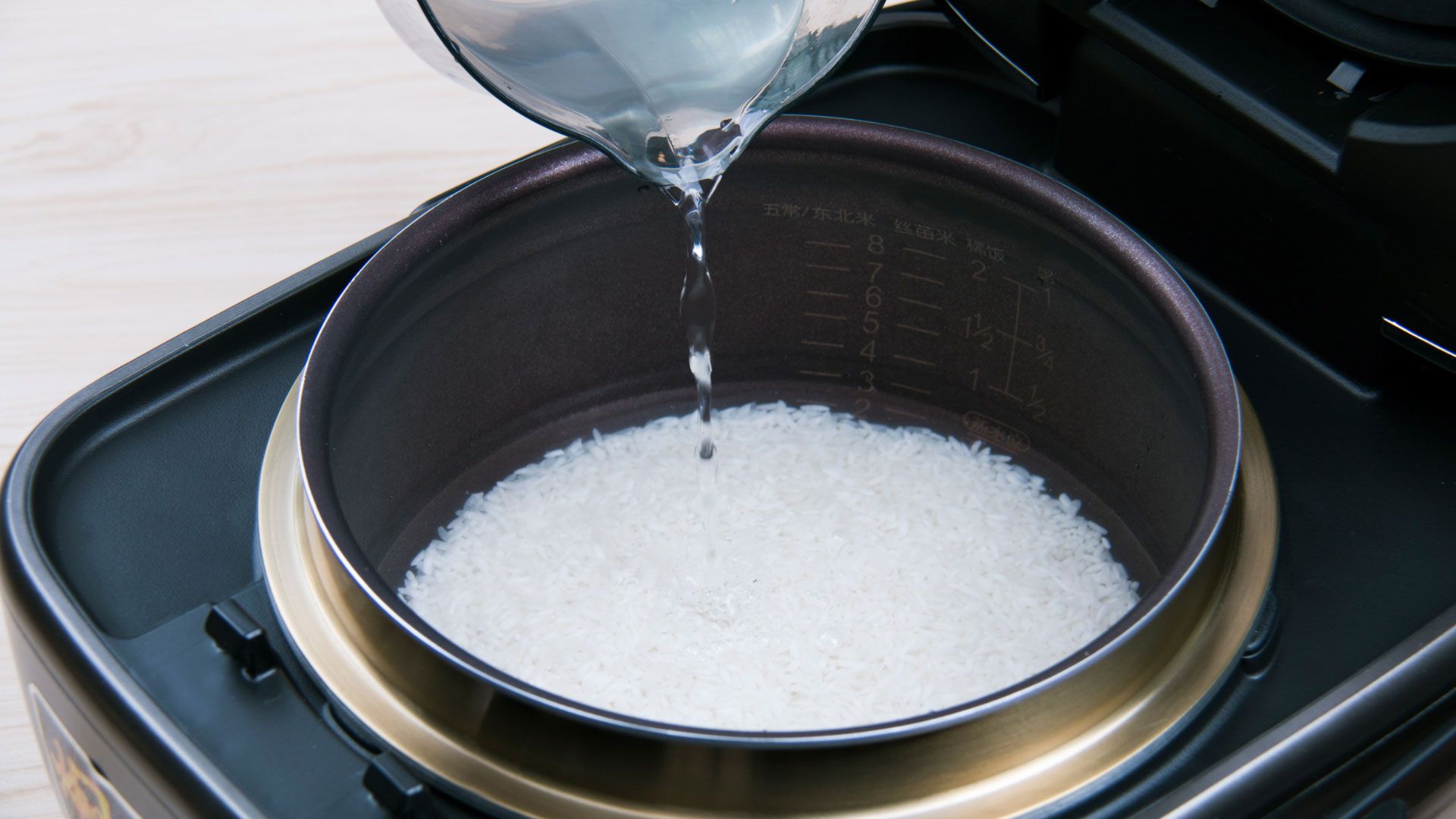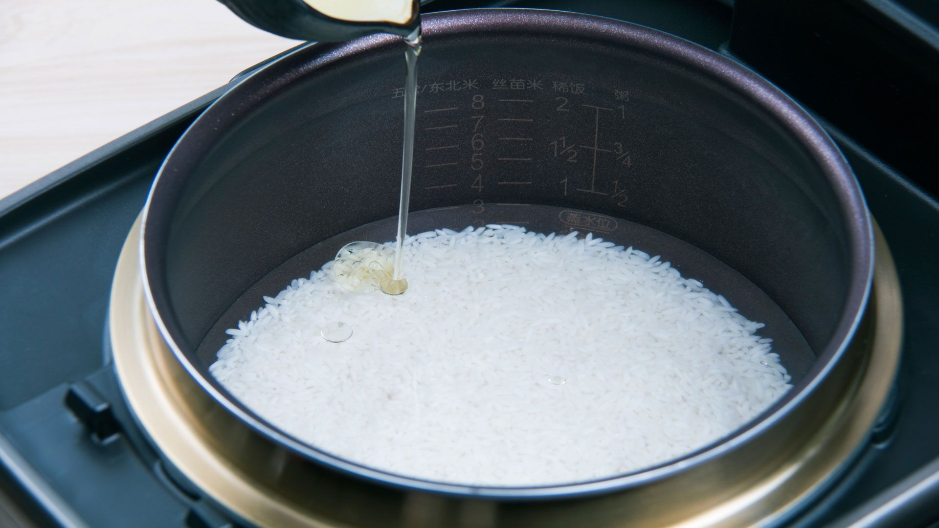 大米洗净放到饭煲内锅中,注入清水至煮饭3刻度水位。