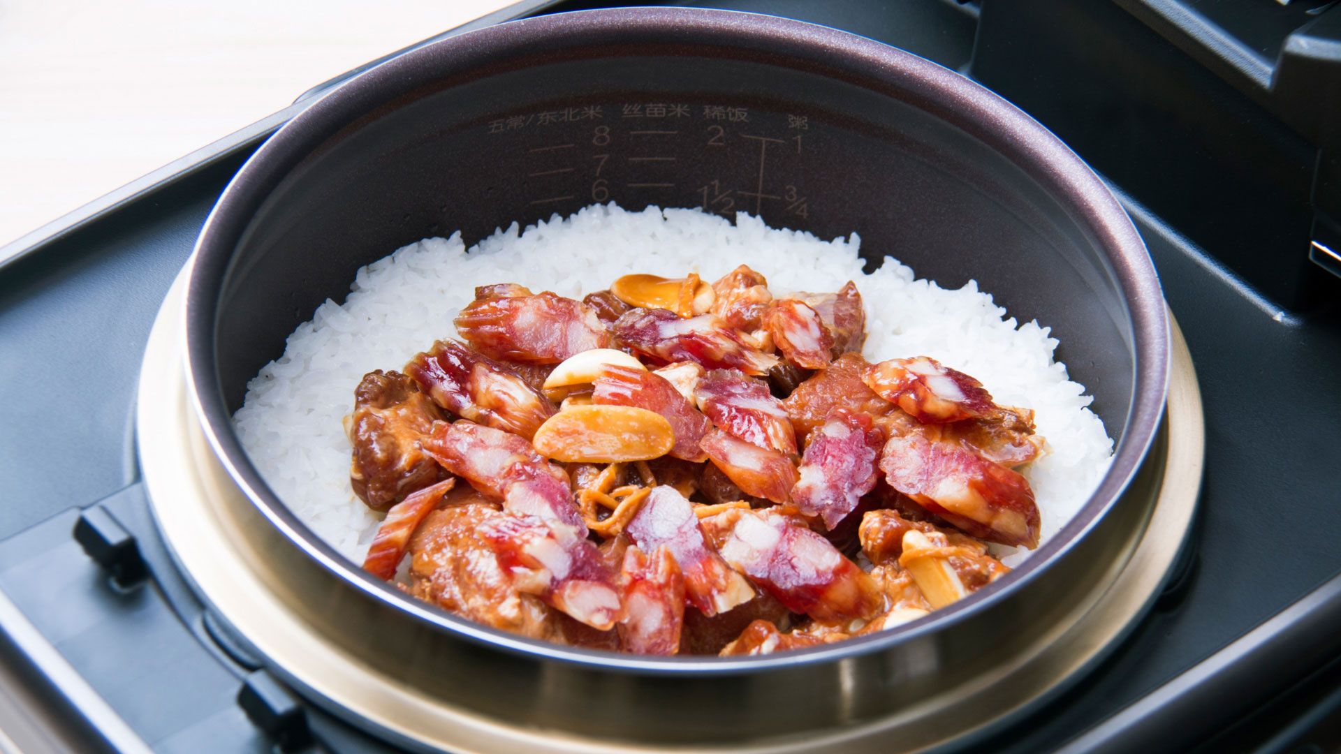 25分后(饭开始收干水份了),开盖、将腊肠、腌好的食材铺在米饭表面,合盖继续煮。