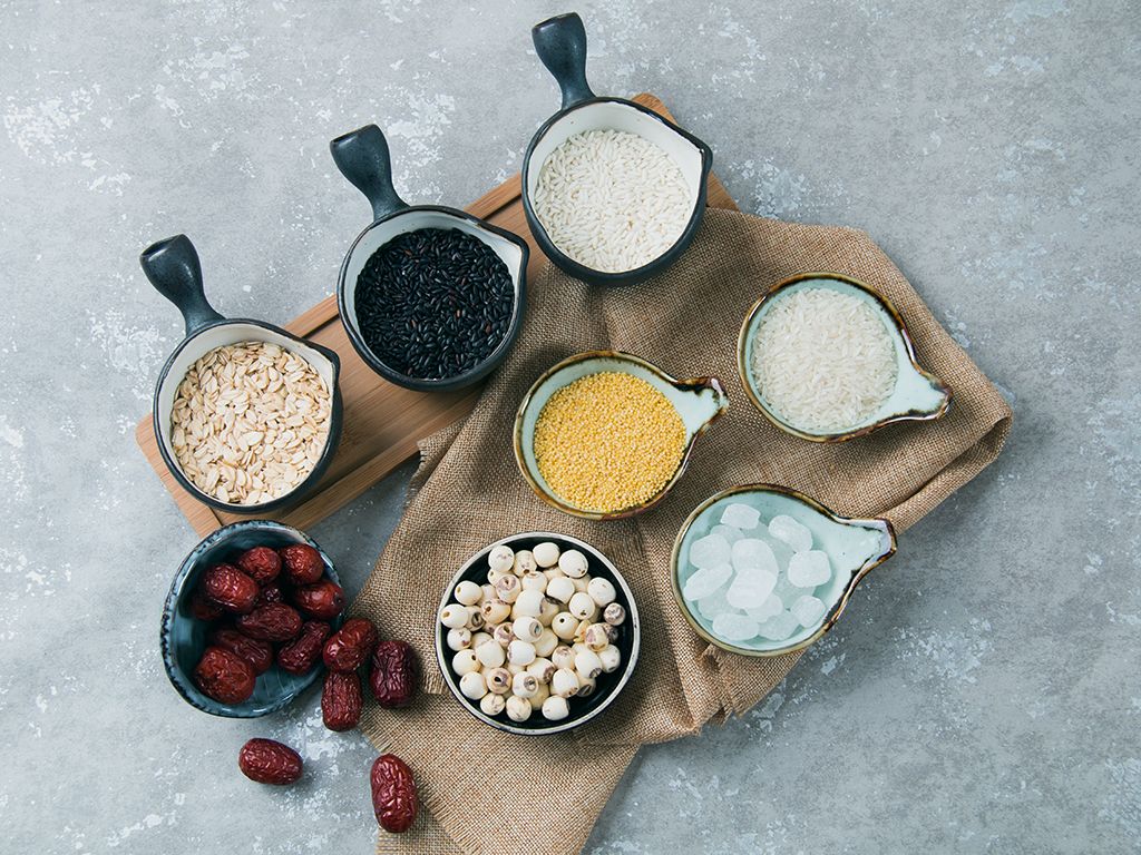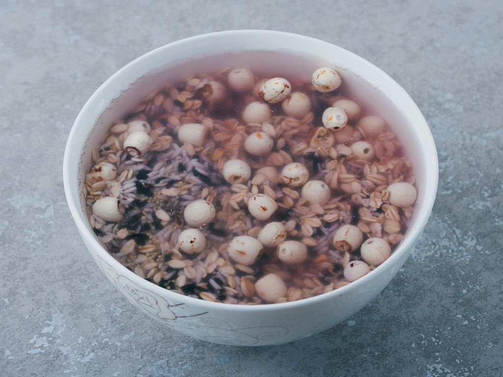 将黑米、燕麦、大米、糯米、小米、莲子称好放入容器洗净,用清水浸泡30分钟。