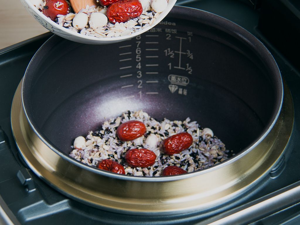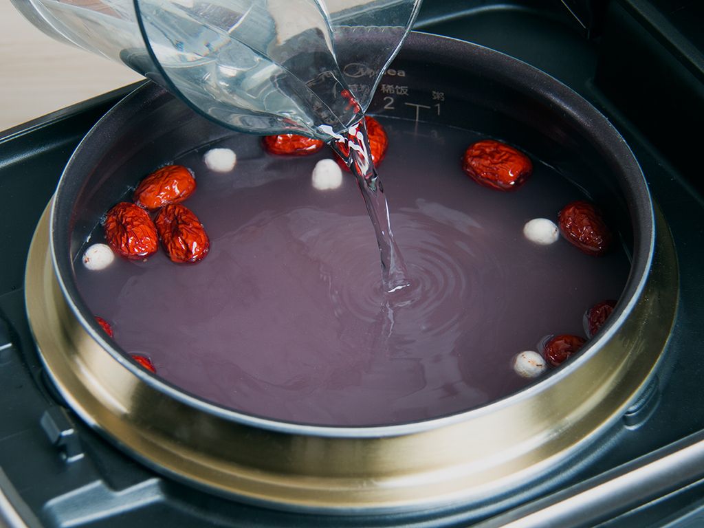 浸泡好的米沥干放入内胆加入红枣、冰糖。