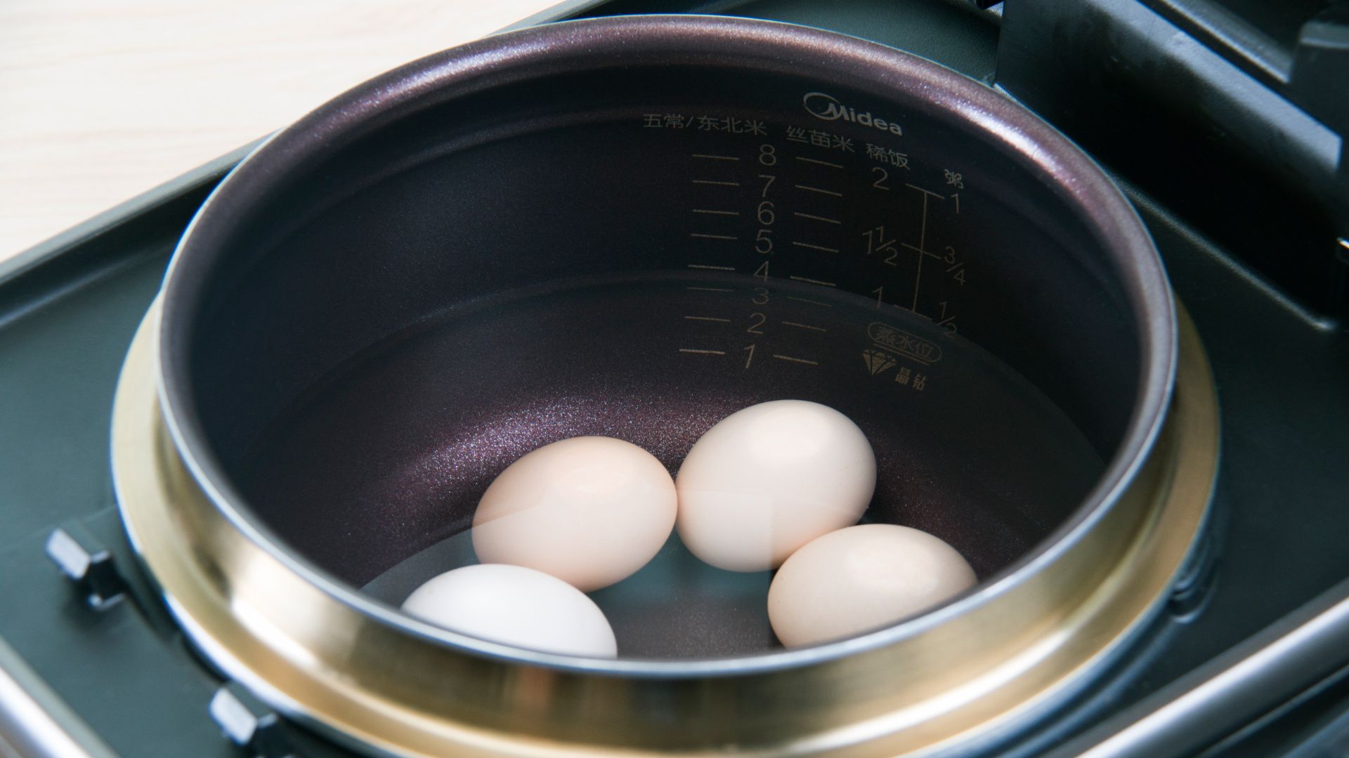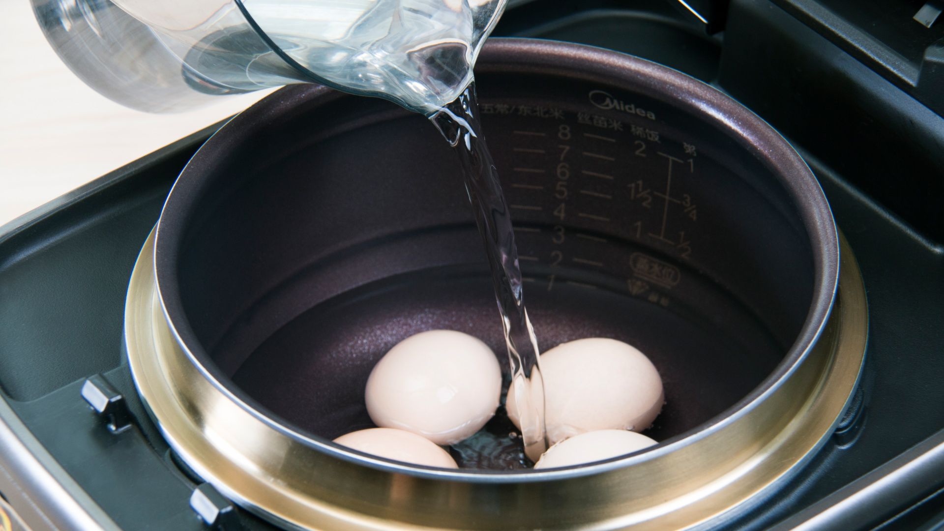 把鸡蛋放入饭煲内胆(约4个),加70度的开水没过鸡蛋;(可按个人喜好增减鸡蛋及水位,水需满过鸡蛋)。