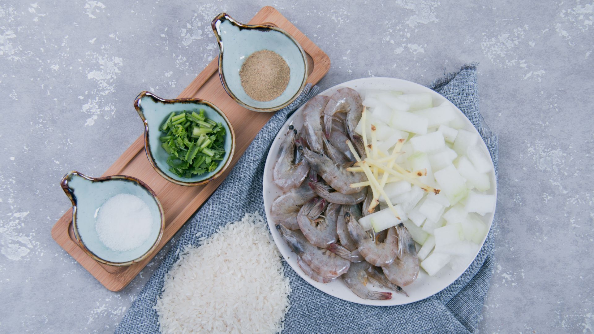 准备好食材,将食材洗净、大米沥干、冬瓜去皮切丁、大虾去须、姜切丝、香菜切末待用。