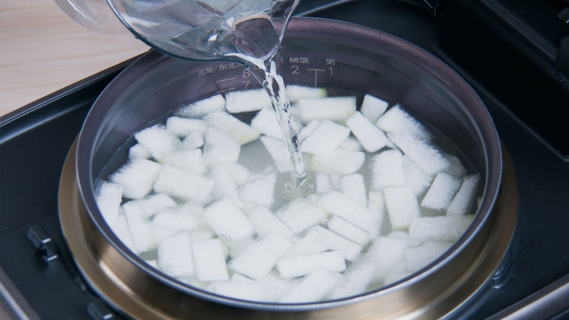 把冬瓜、大米一同倒入内锅加水至稀饭2刻度水位,合盖开始烹饪。