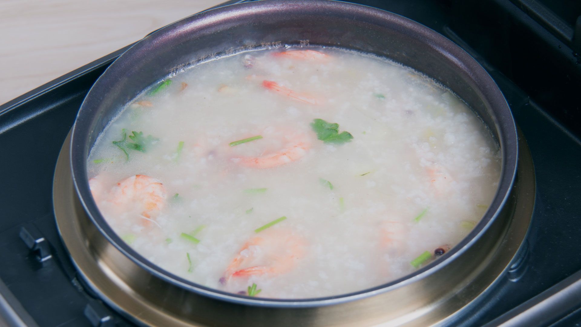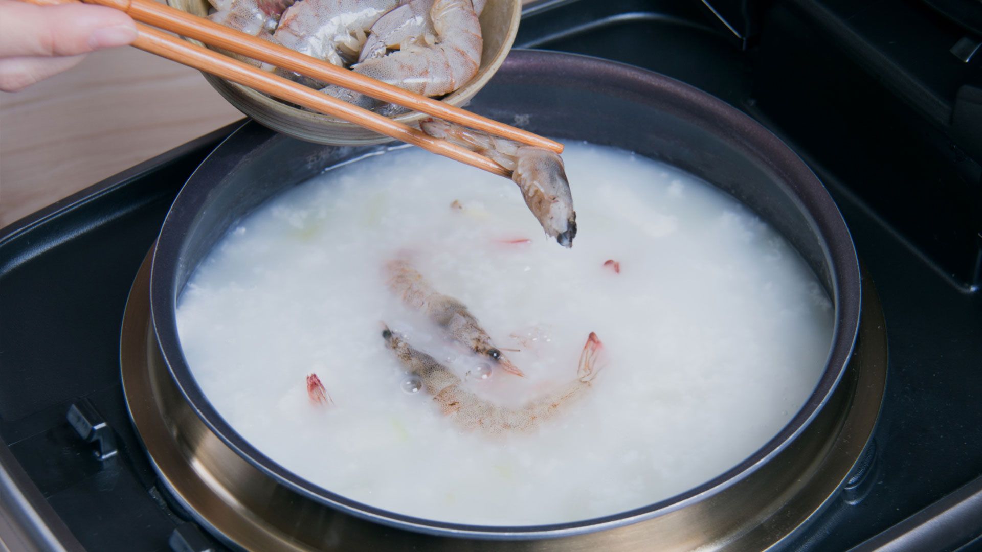 待饭煲煮粥至1小时30分后开盖倒入大虾。