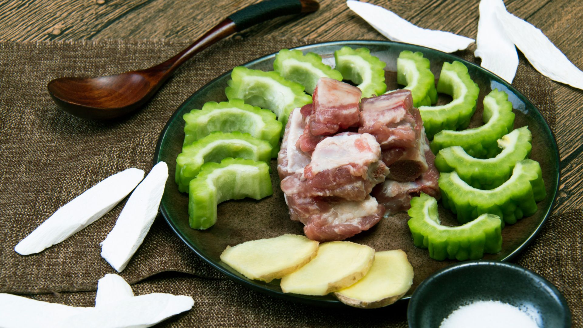 准备好食材,将排骨剁开、淮山、苦瓜切块、姜切片待用。