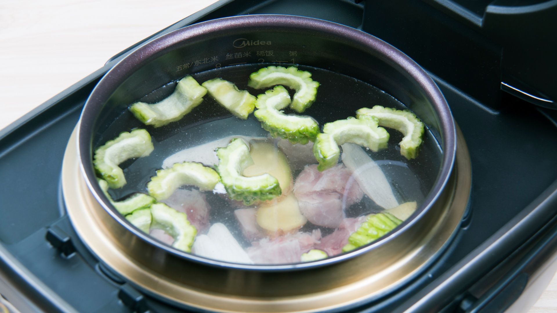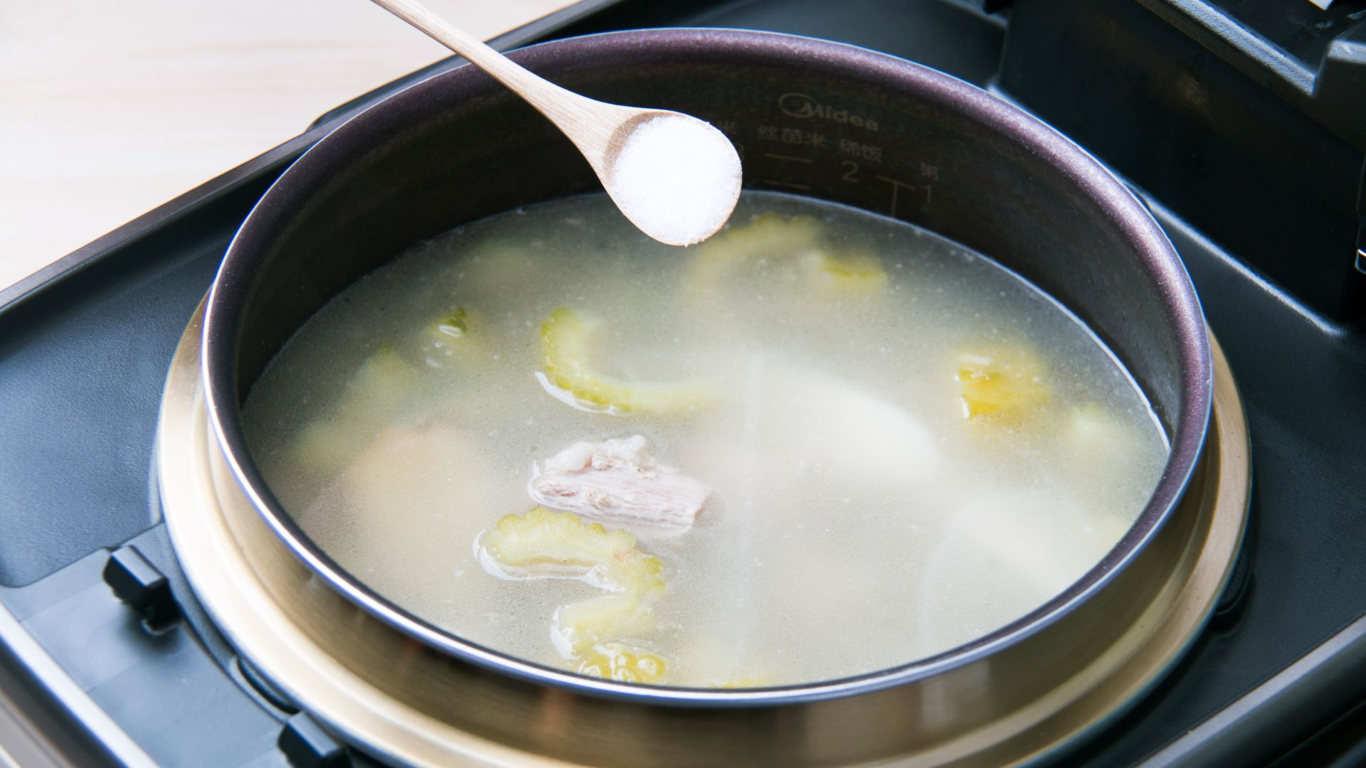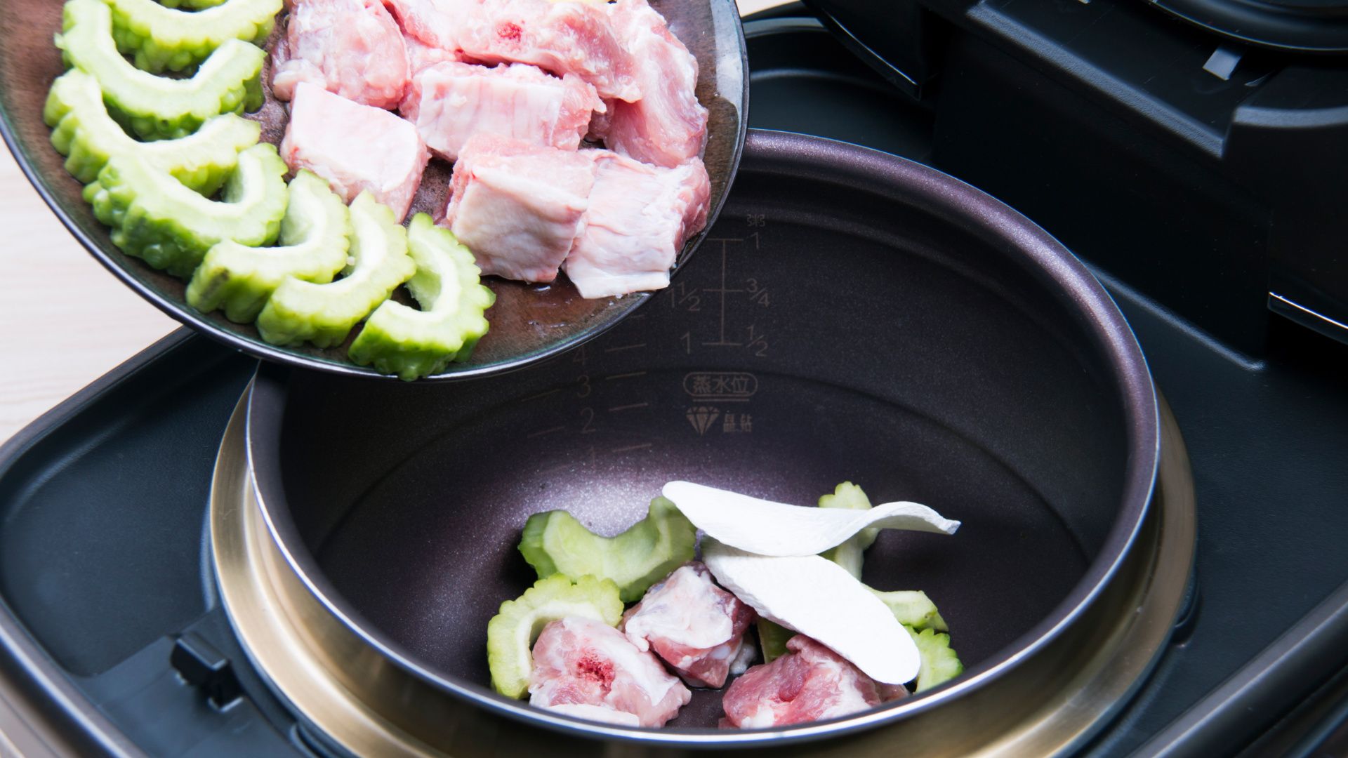加入清水至稀饭2刻度水位,合盖开始烹饪。