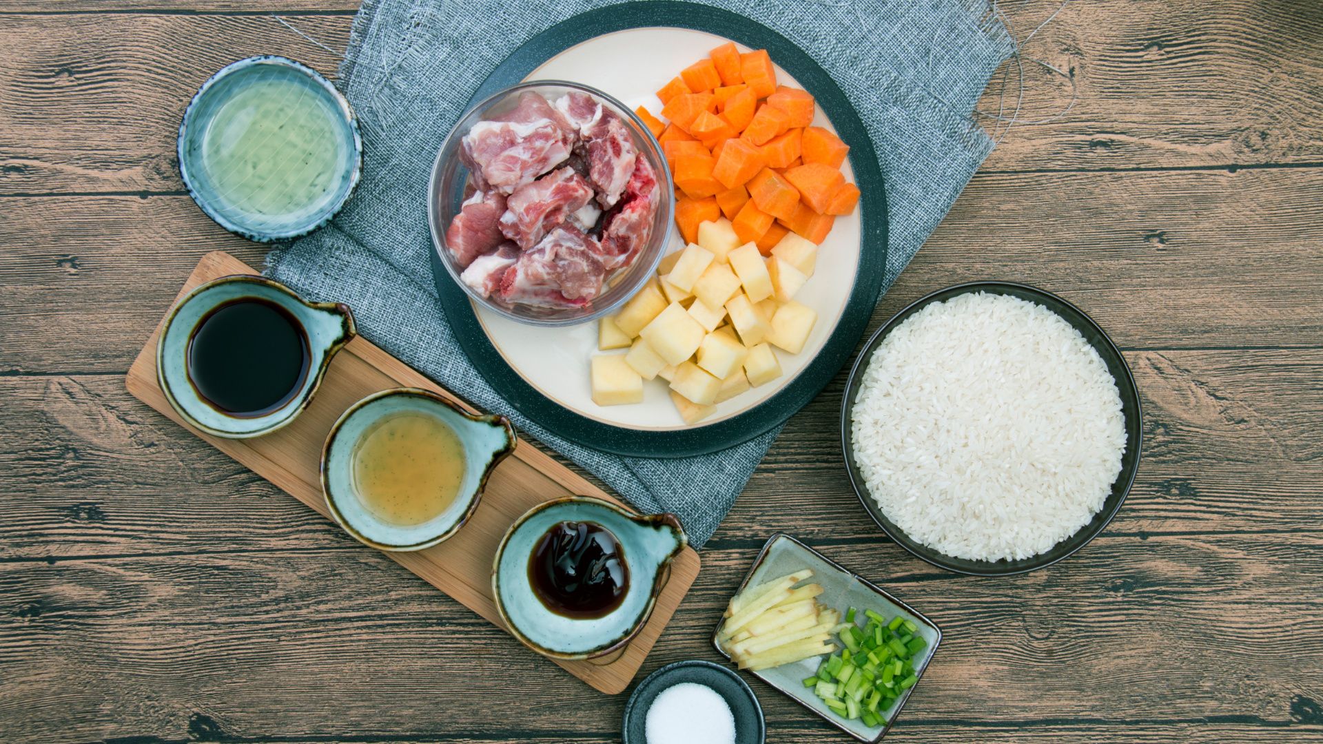 准备好食材、洗净。将排骨剁成小块,土豆、胡萝卜切小丁,姜切丝、葱切碎待用。