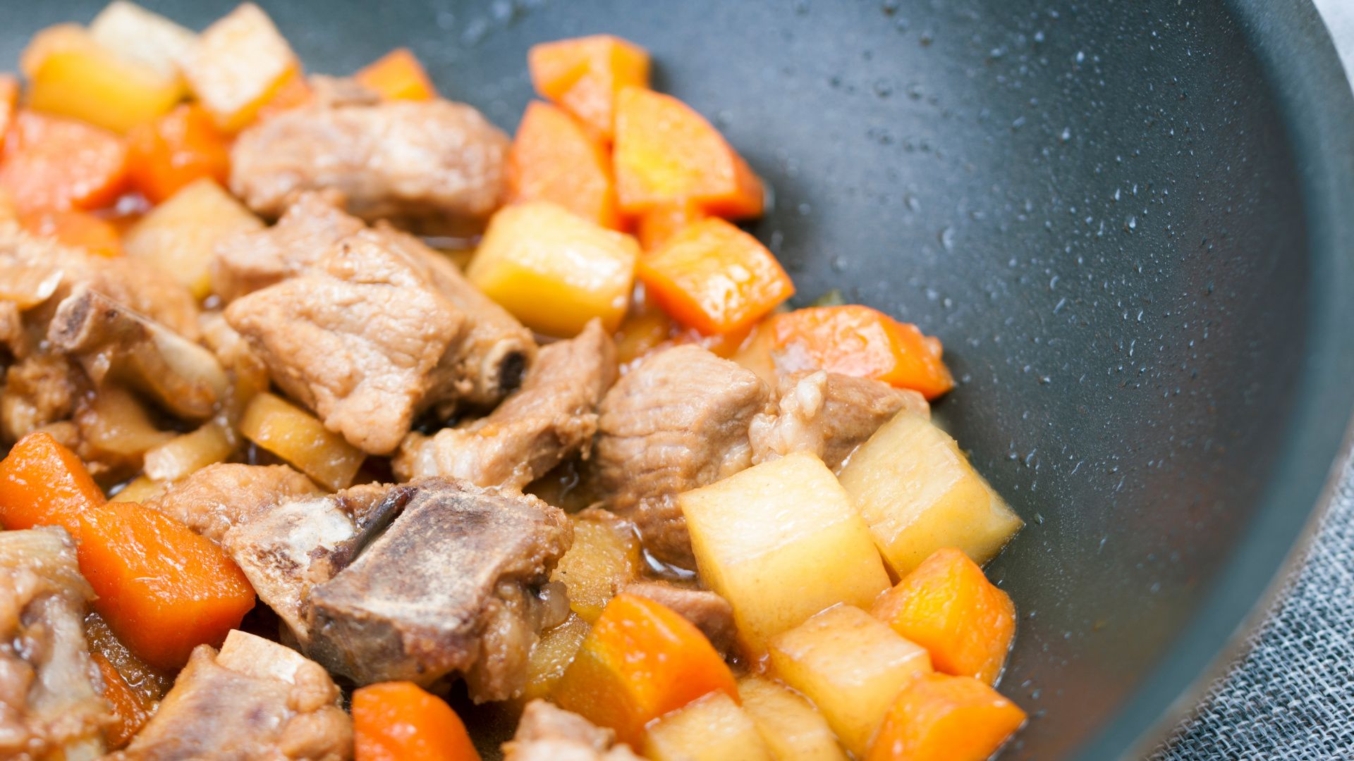 炒锅加油将葱头、姜丝爆香倒入土豆、胡萝卜及排骨翻炒,加入调味翻炒至6成熟。