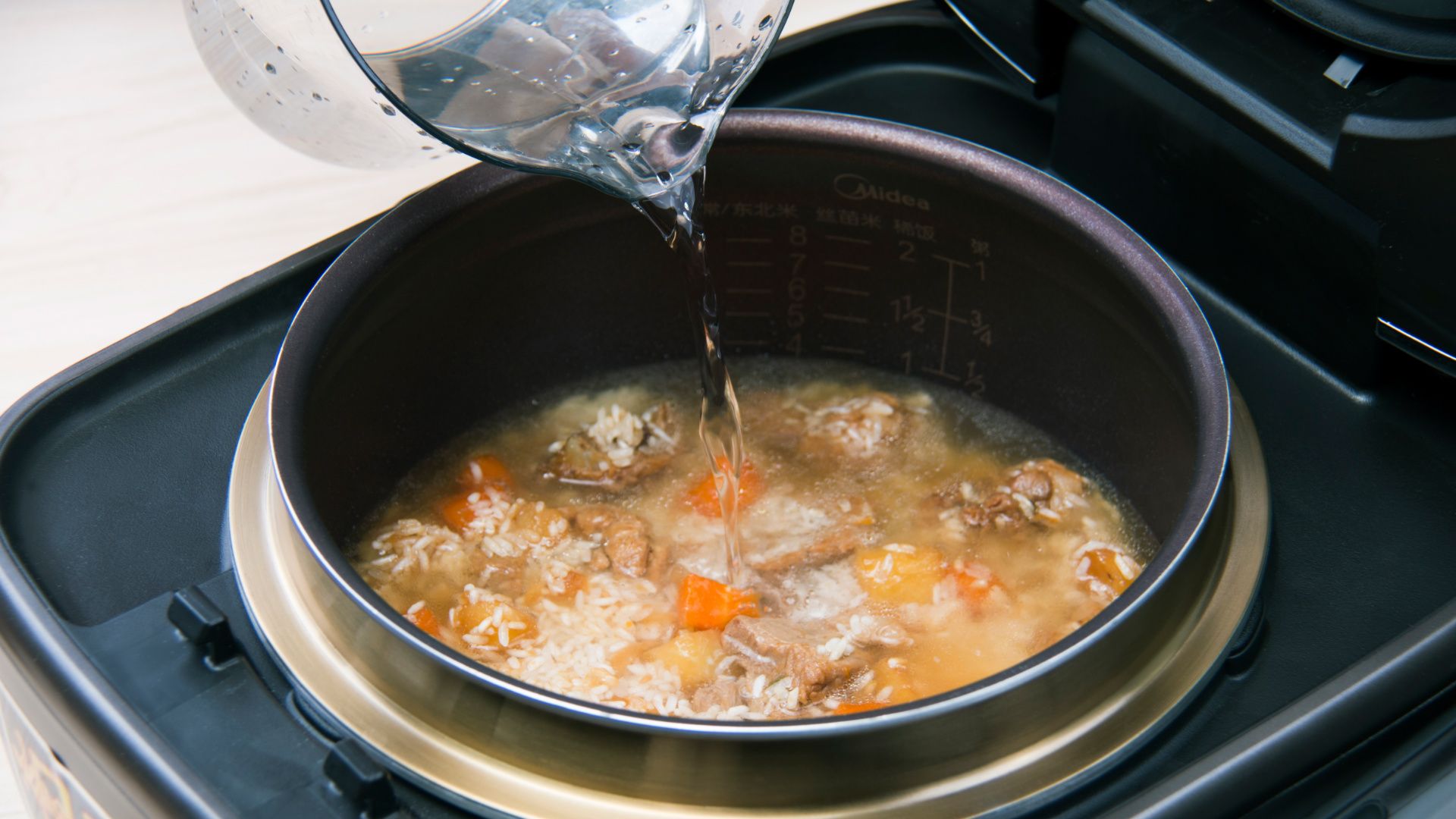大米洗净后放入锅中,注入清水至煮饭3刻度水位,再加入炒好的排骨。