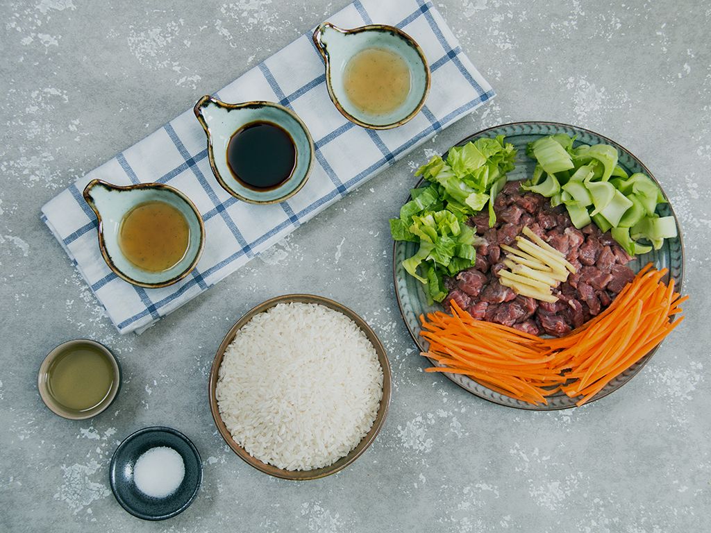 准备好食材。大米洗净沥干,牛肉切丁、红萝卜去皮切丝、芥菜切碎备用。(食材可按个人喜欢自己调配)
