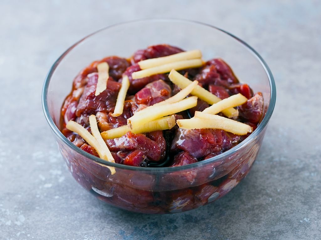 牛肉倒入容器,加入生抽、料酒、姜、盐搅匀腌制5分钟。