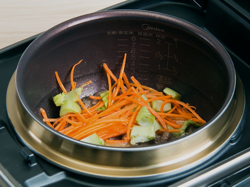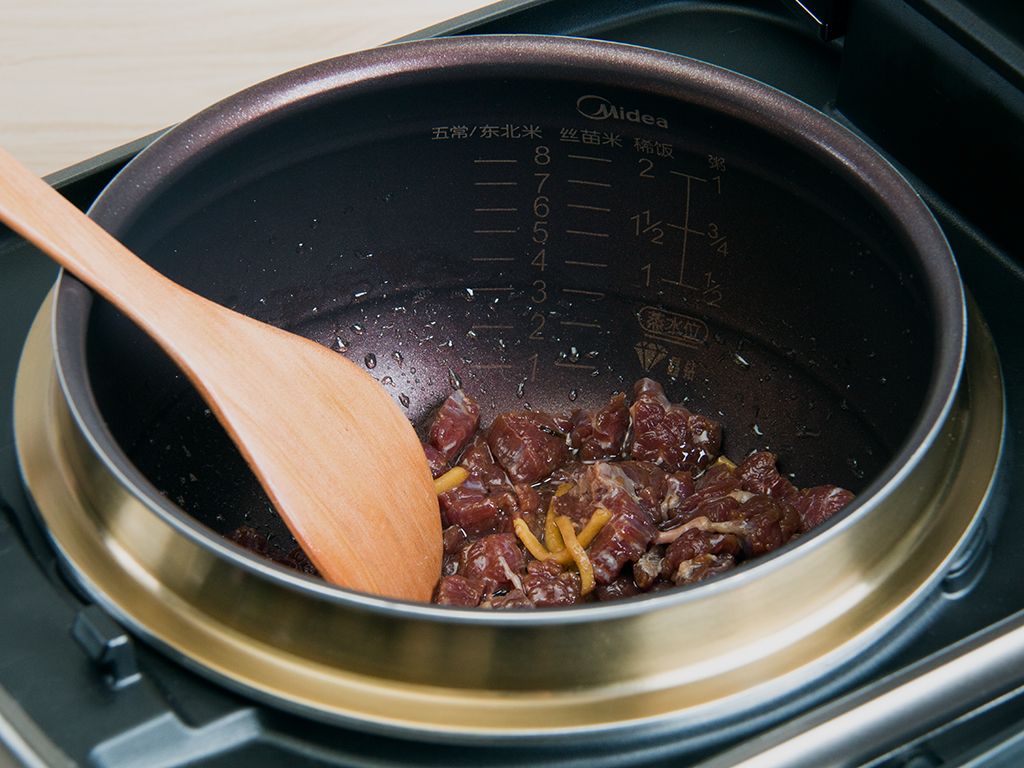内锅放入饭煲倒入花生油,开始预热2分钟。将腌好的牛肉倒入锅内翻炒8成熟。