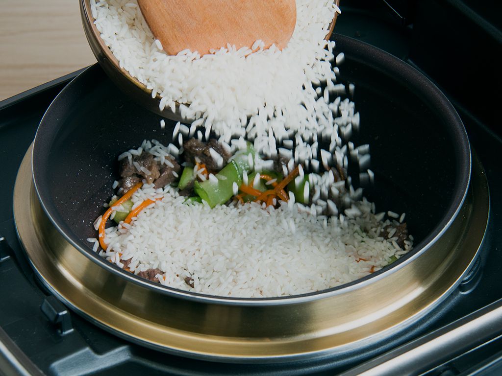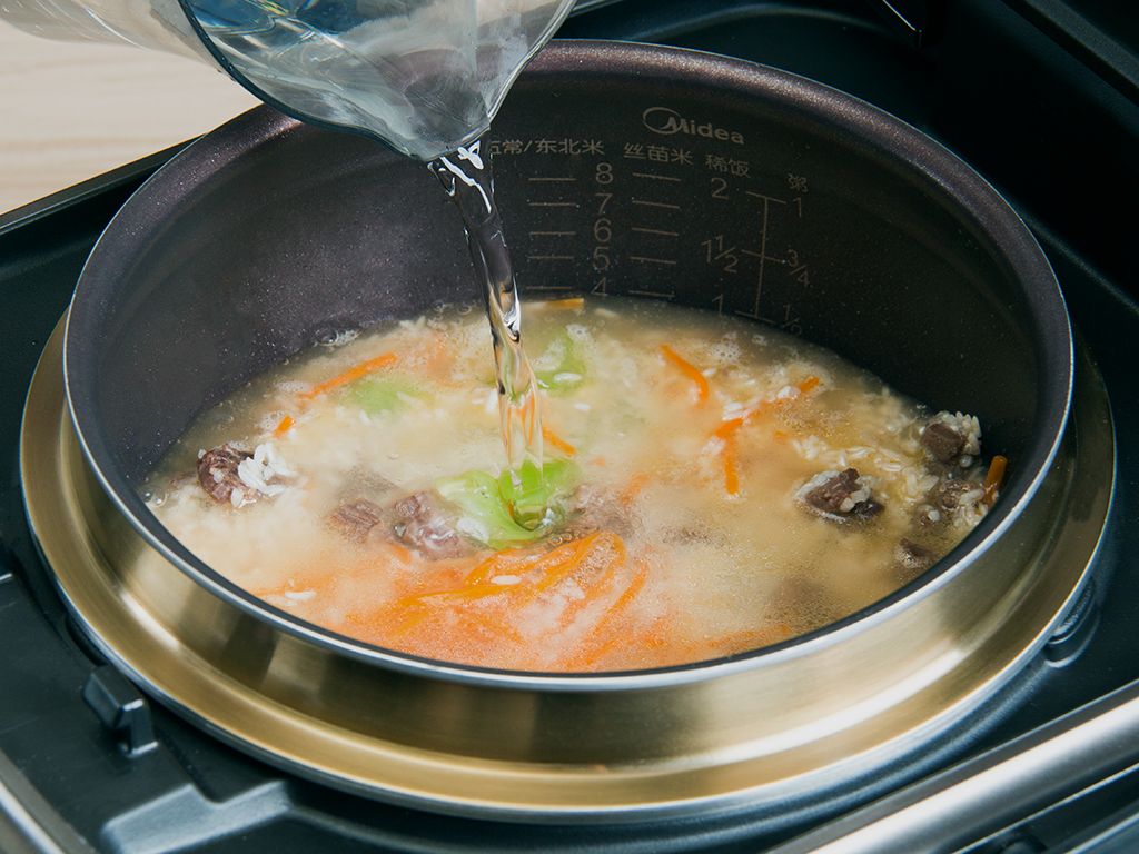 加入清水至4刻度半搅匀,(由于食材吸水程度不一样,可稍微加多点水)合盖开始煮食。