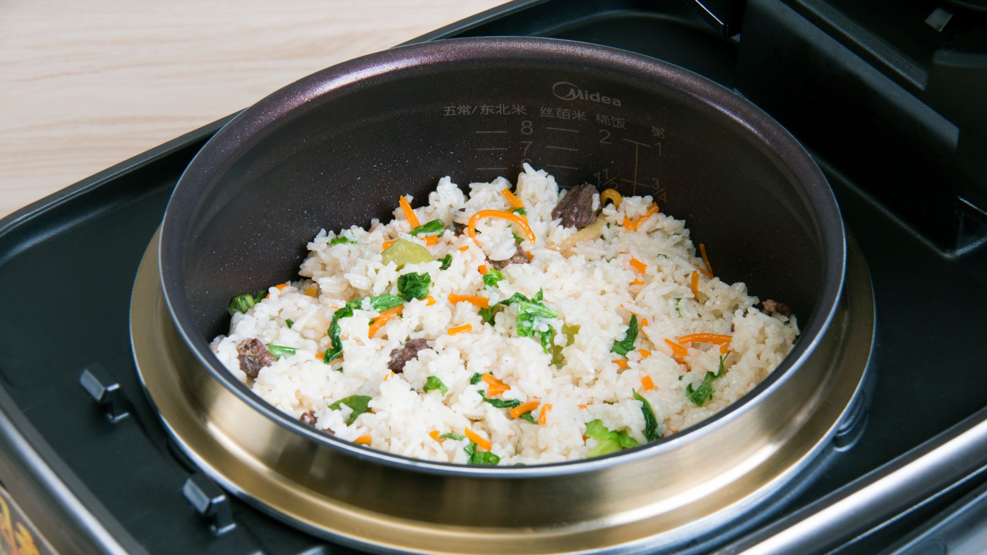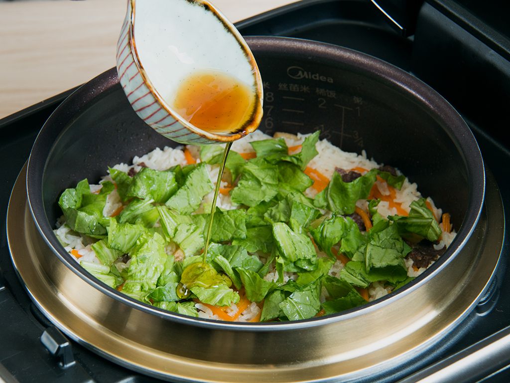 待饭煲显示倒计时,开盖倒入菜叶、淋入香油与米饭搅匀,合盖继续煮食。
