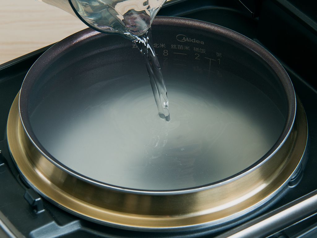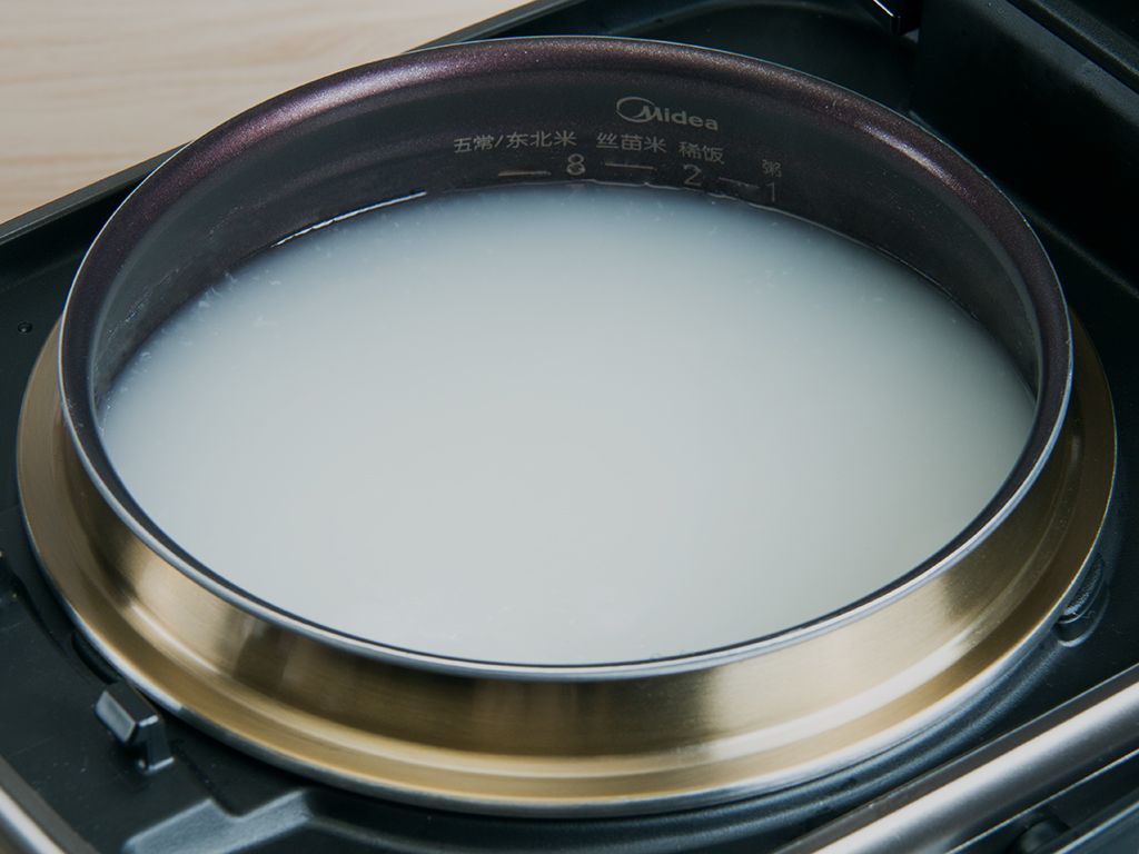 大米适量放入容器,反复淘洗干净沥干,倒入内胆注入清水至煮粥1刻度水位。