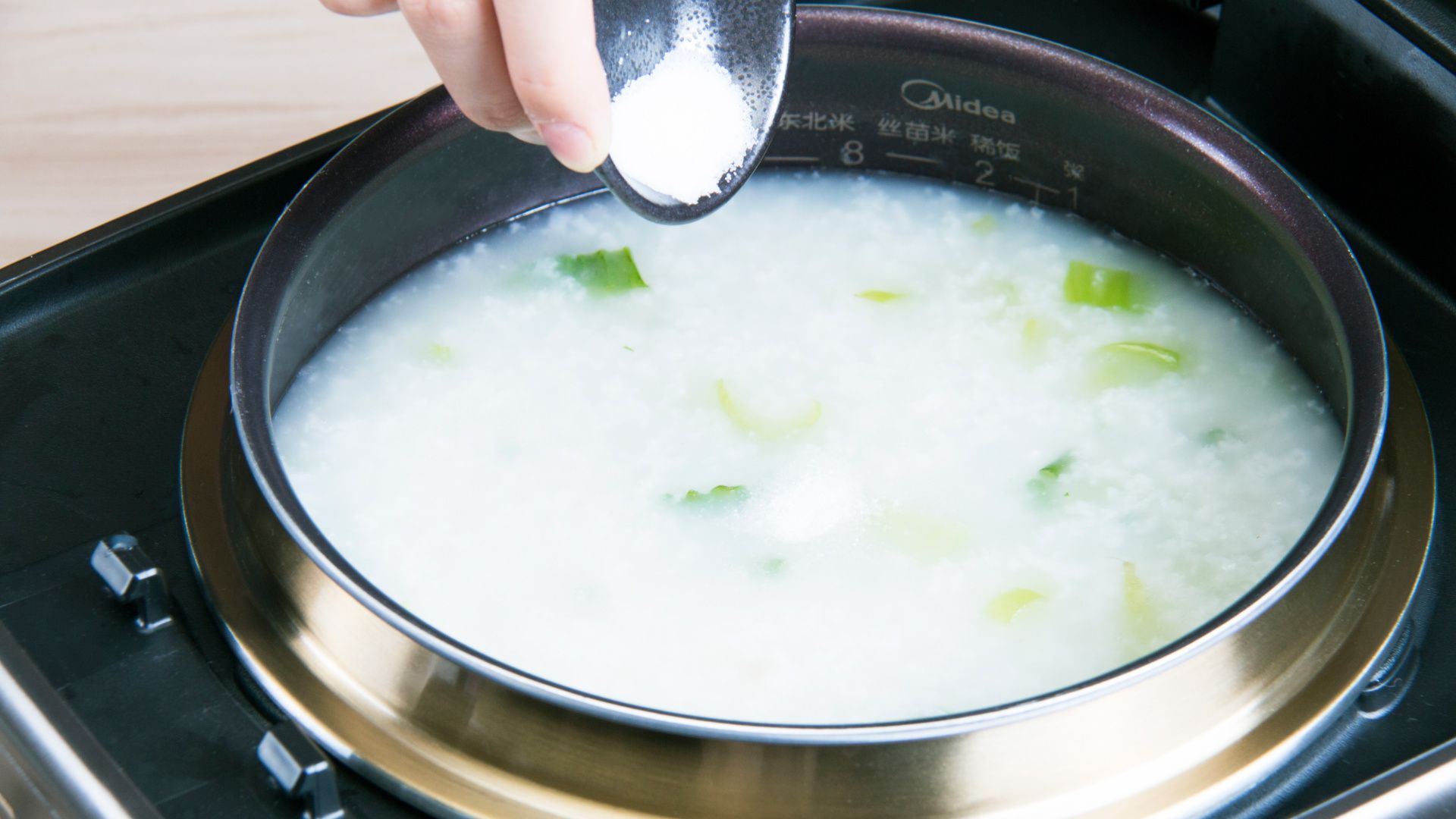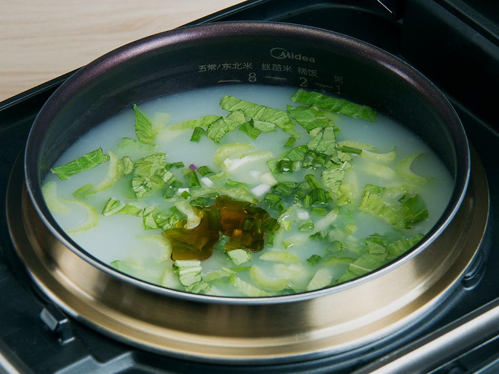 待饭煲烹饪剩余10分钟后倒入青菜、葱花、香油搅匀直至烹饪结束。
