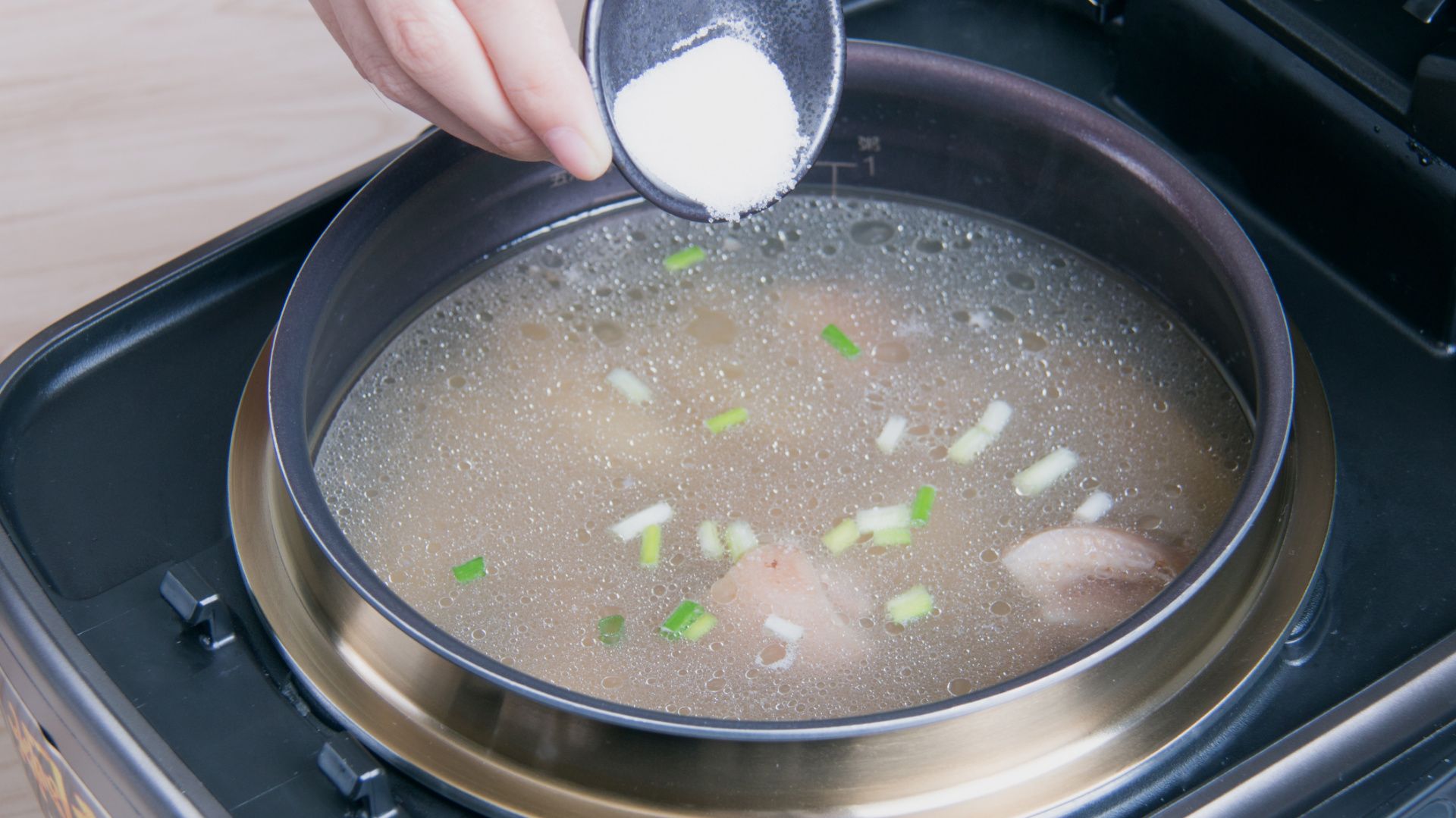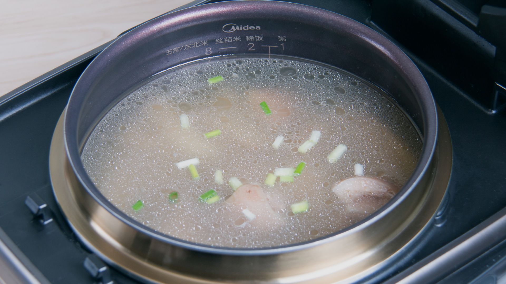 猪蹄过水沥干倒入内锅,加入淮山、姜,注入清水。