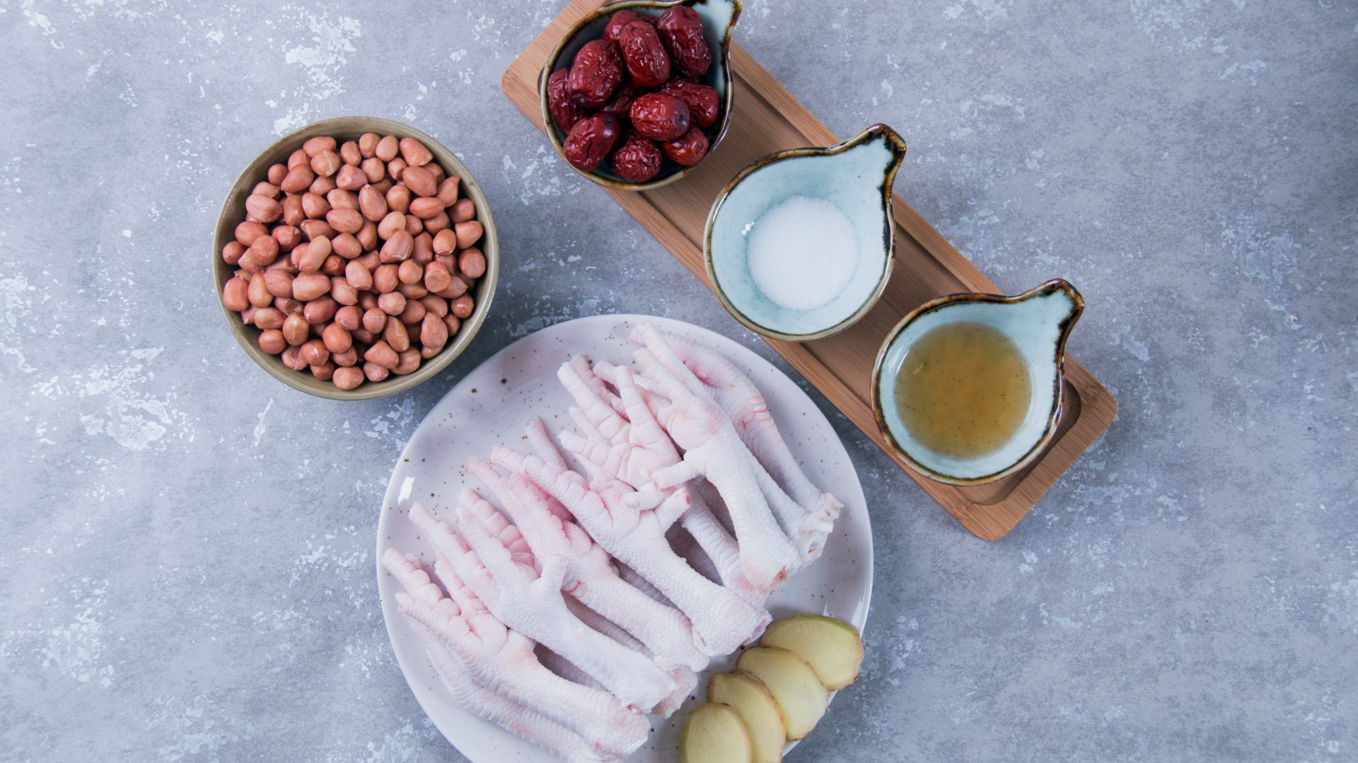 准备好食材,将食材(鸡爪、花生、红枣)洗净,鸡爪飞水、姜切片待用。花生可以放入温水中浸半小时,换清水洗净