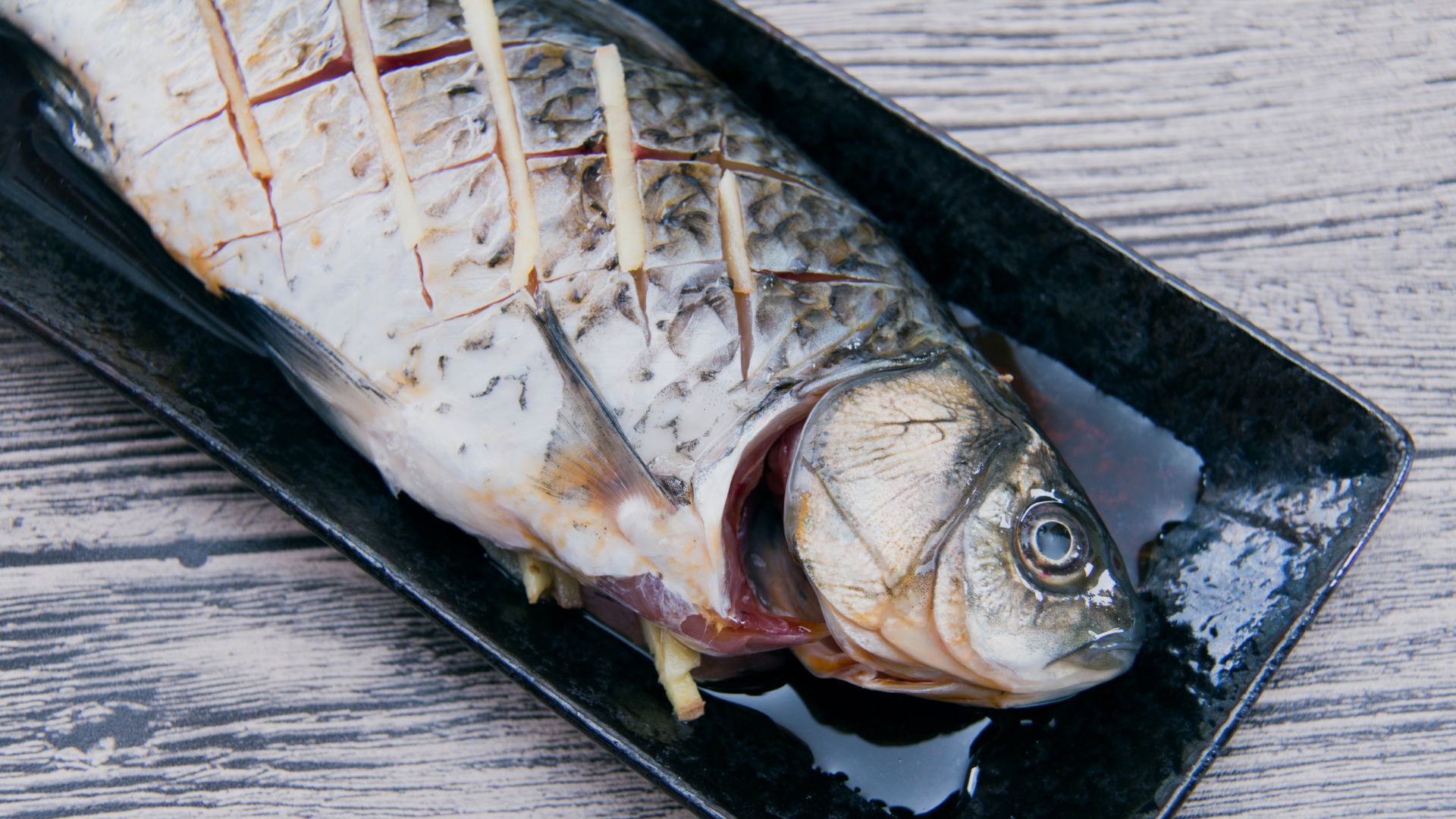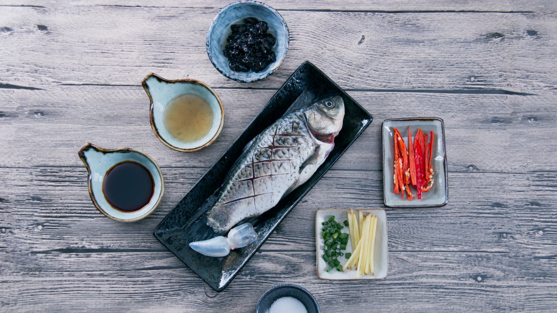 准备好食材,将鱼去鳞、去内脏洗净鱼背上划花刀、红辣椒丝、姜、葱切丝待用。