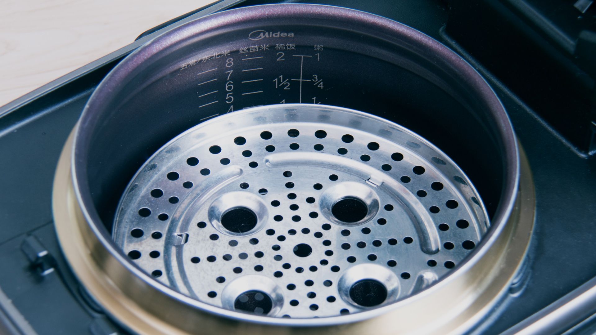 饭煲内胆加水至煮饭3刻度水位放上蒸笼。