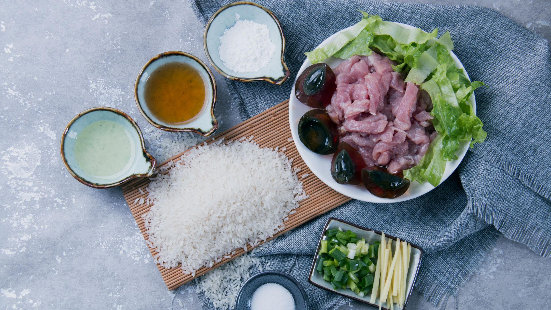 准备好食材,瘦肉、姜切丝、青菜、葱切碎,皮蛋去壳切块待用。