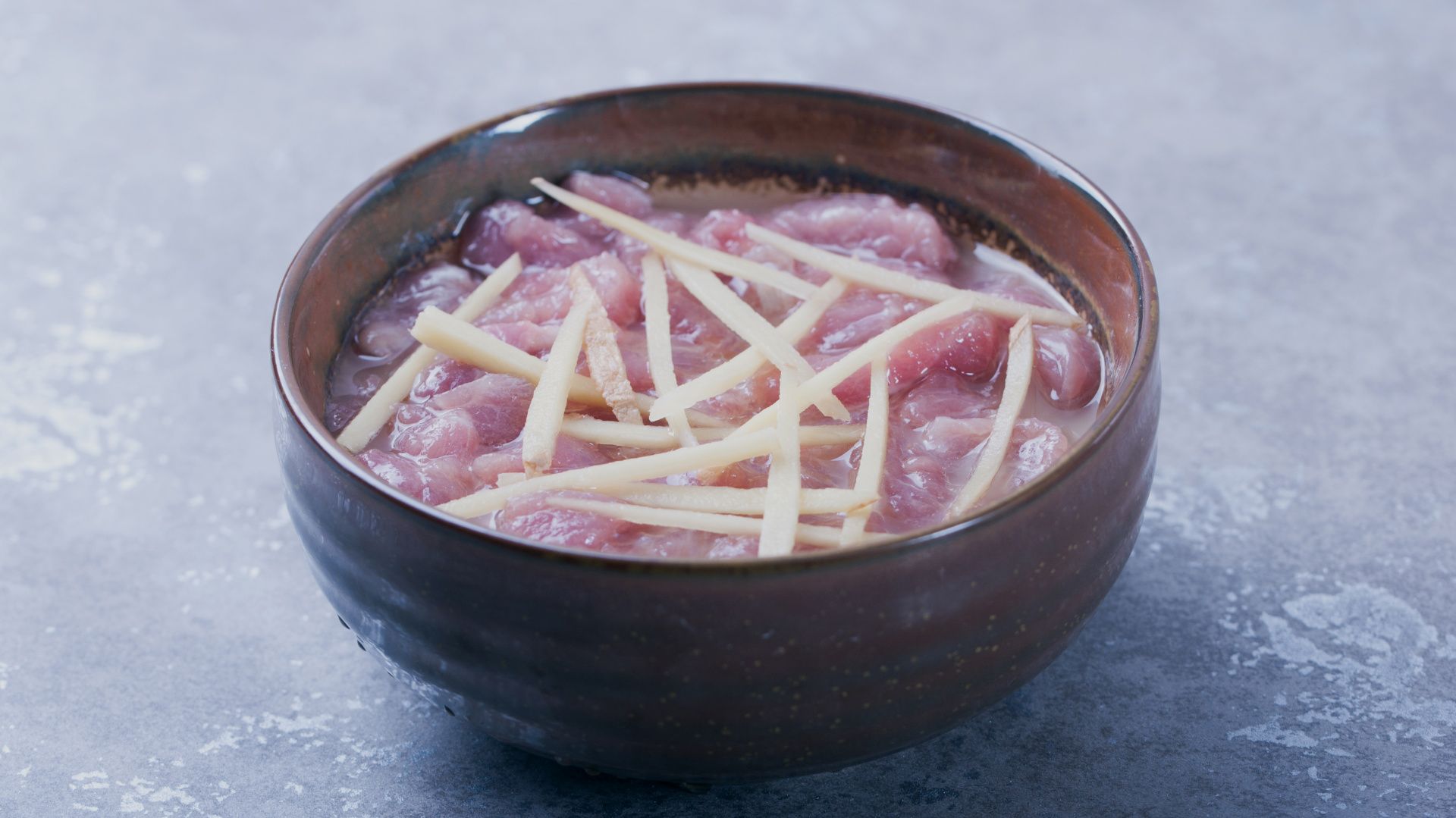 将瘦肉装入容器加入油、料酒、生粉、姜、盐搅匀腌制。