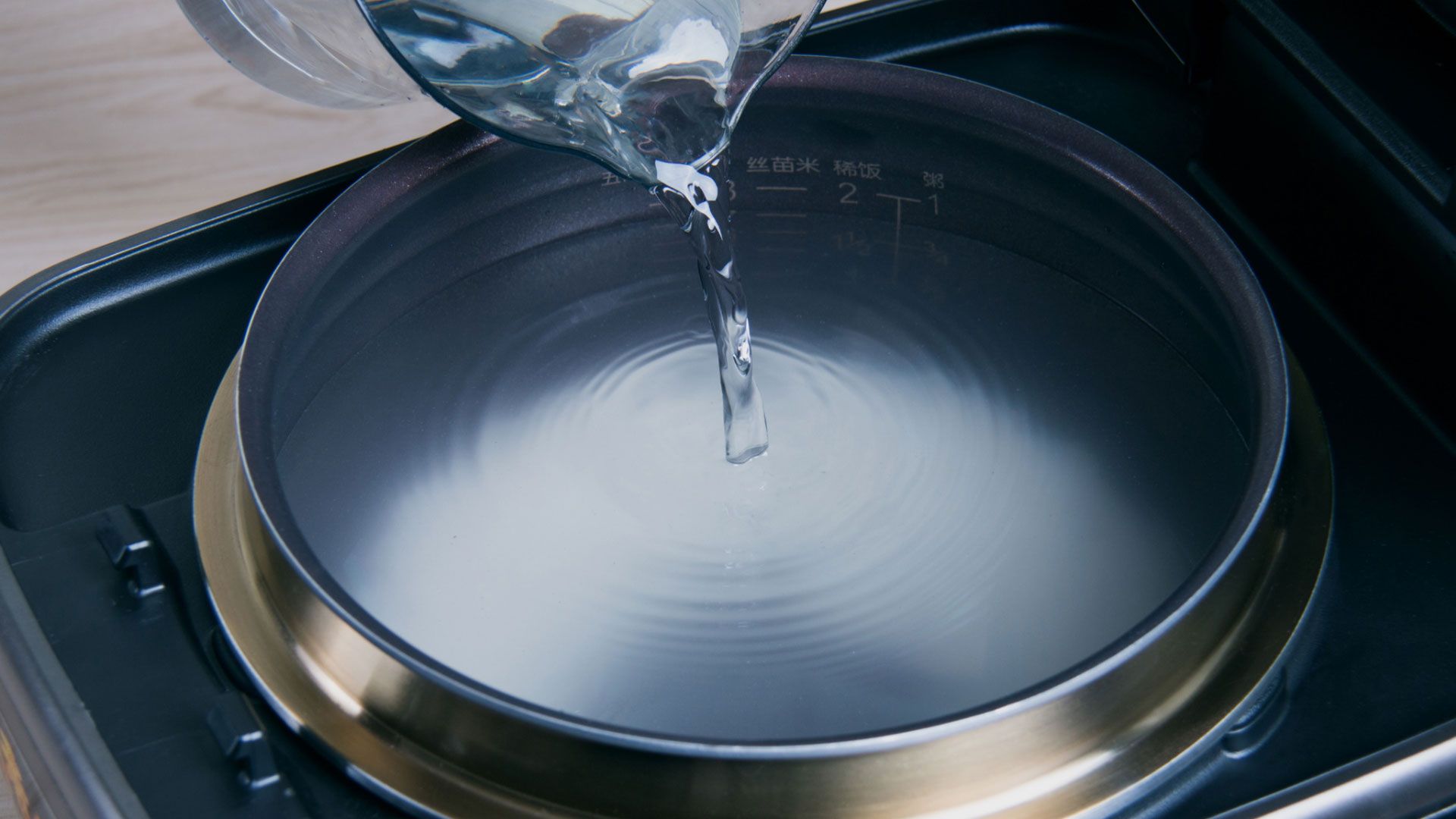 大米洗净倒入内锅注入清水至稀饭2刻度水位,合盖开始烹饪。
