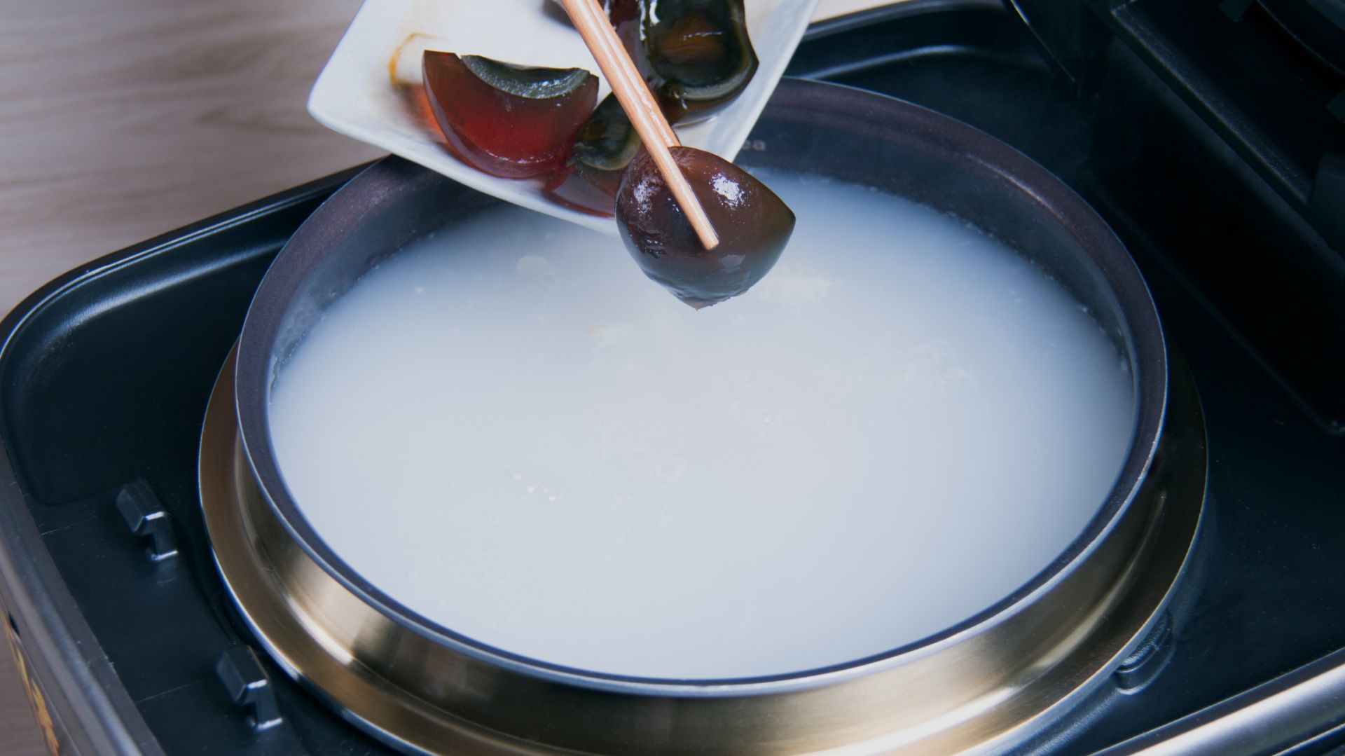 待饭煲熬粥至1小时后开盖放入腌好的瘦肉、皮蛋搅匀,合盖继续煮食。