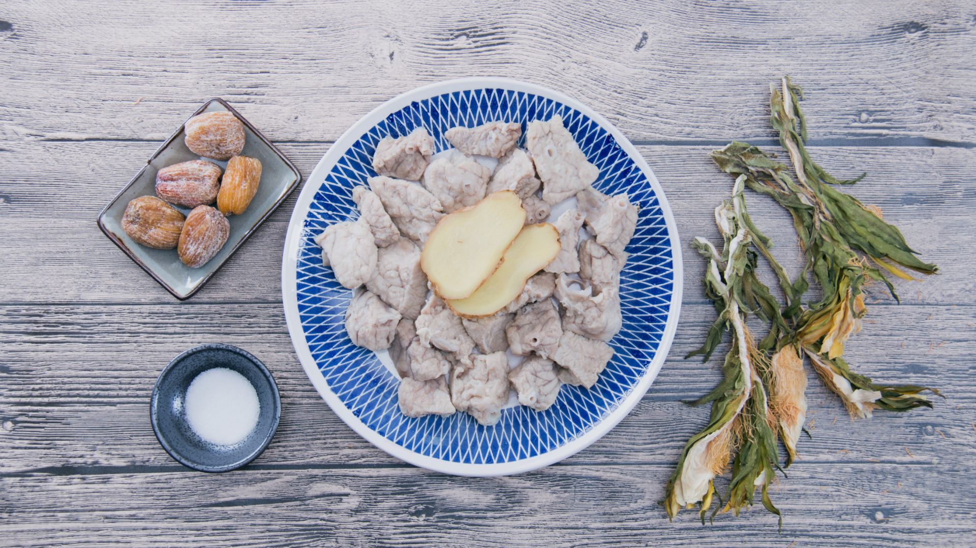 准备好所有材料。猪肺洗净切小块、霸王花用清水浸泡松软。用少许食油在炒锅中炒透猪肺直至出大量的水,捞起沥干水备用。