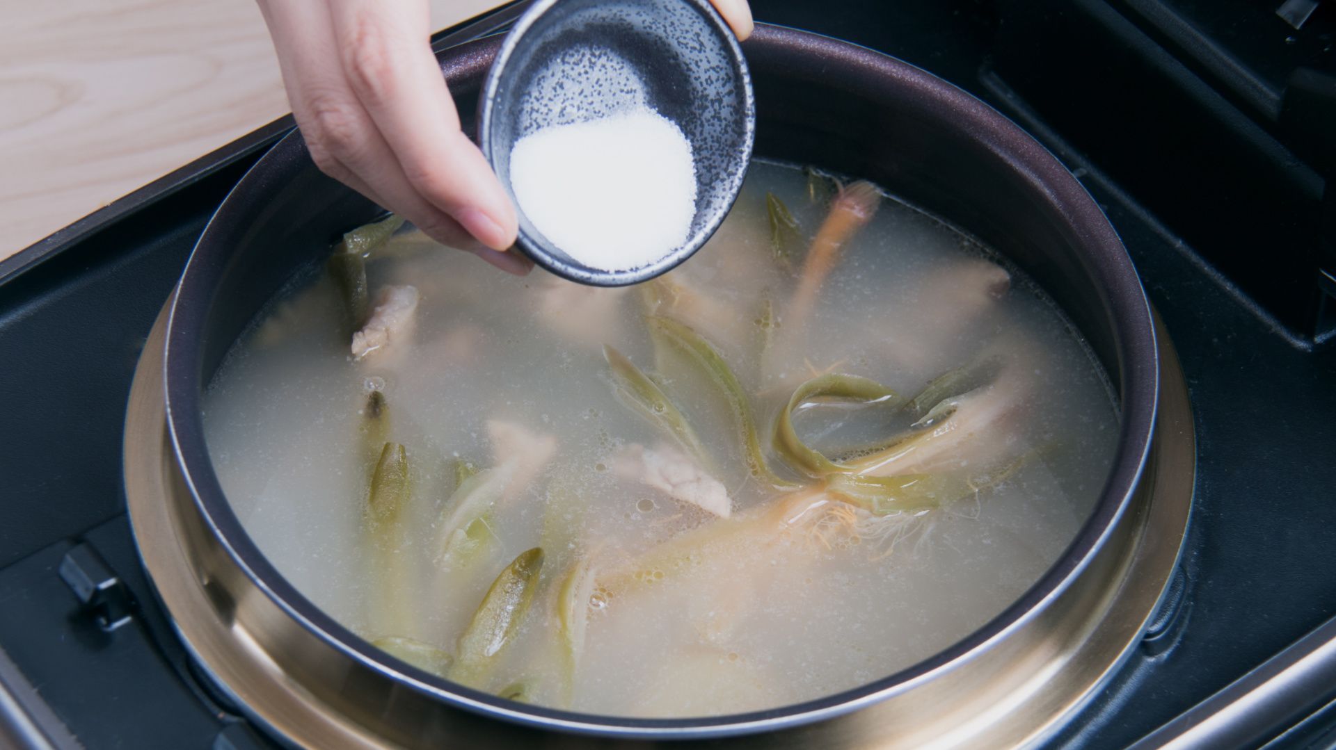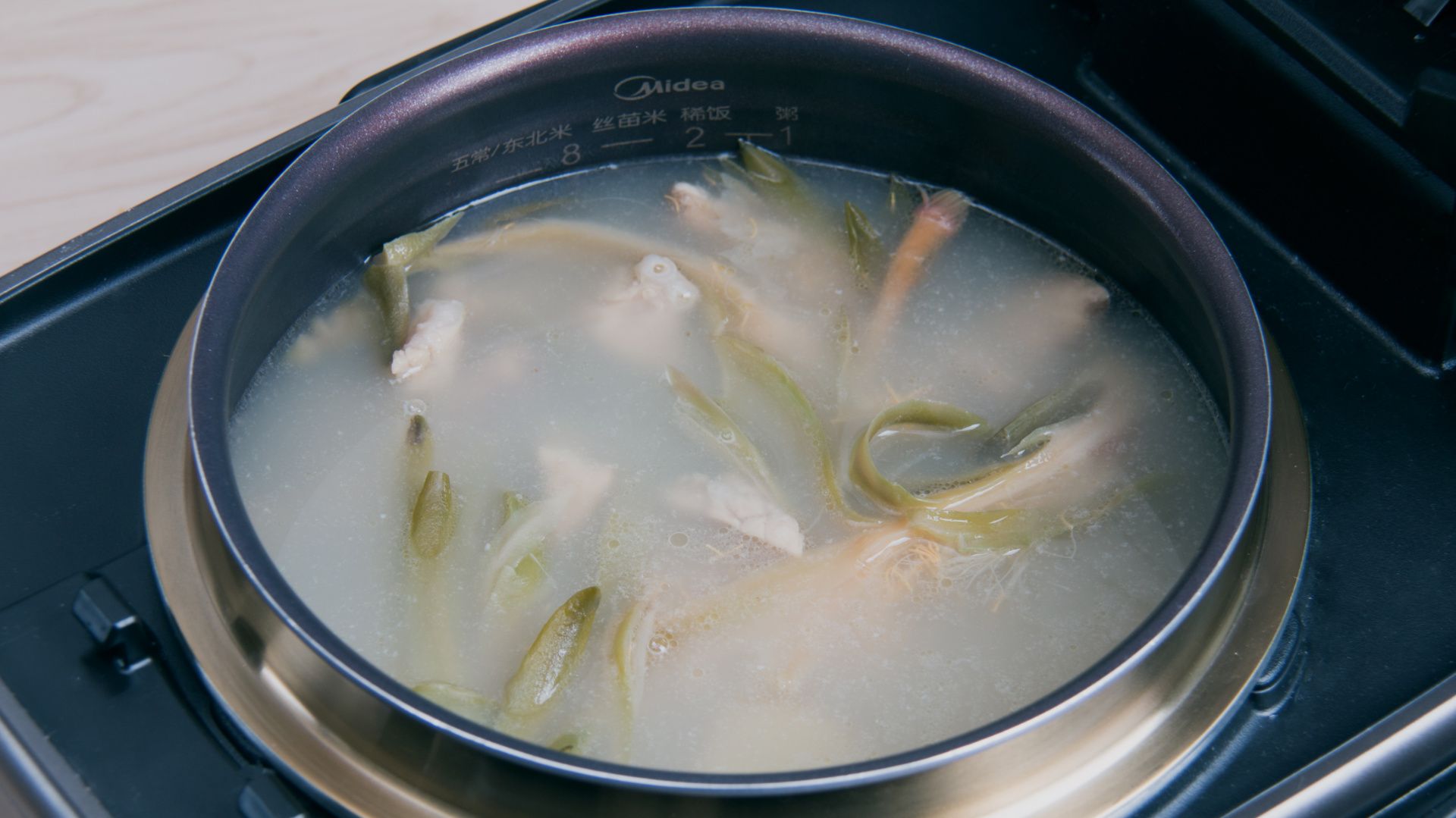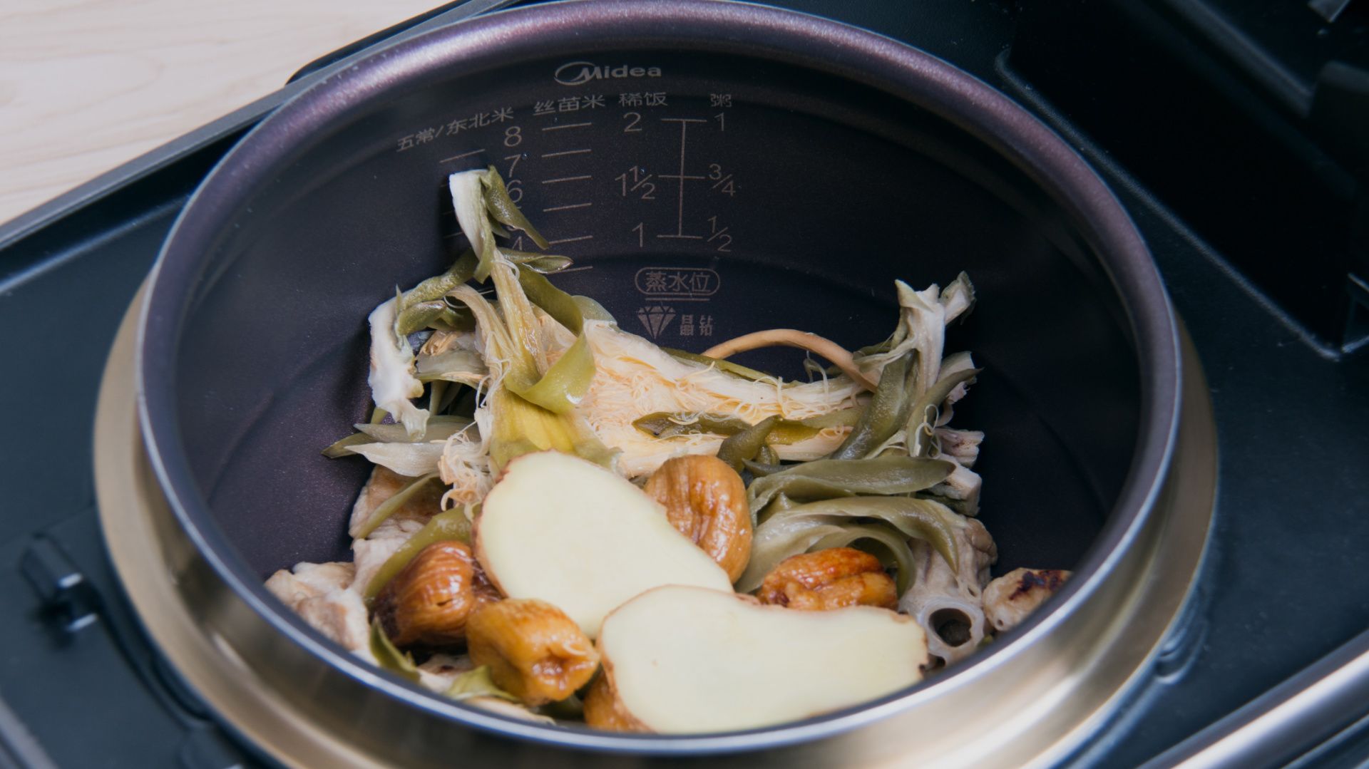 将炒好的猪肺与霸王花、蜜枣、姜一同放入锅内。