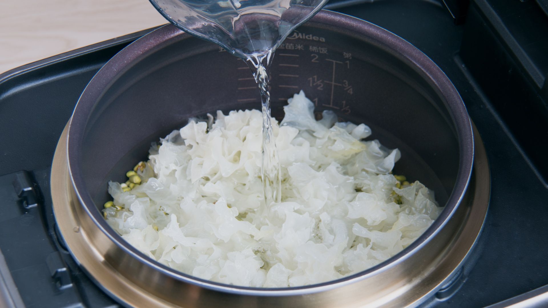 银耳洗净浸泡1小时,捞出,再清洗干净,去除蒂头,撕碎备用。