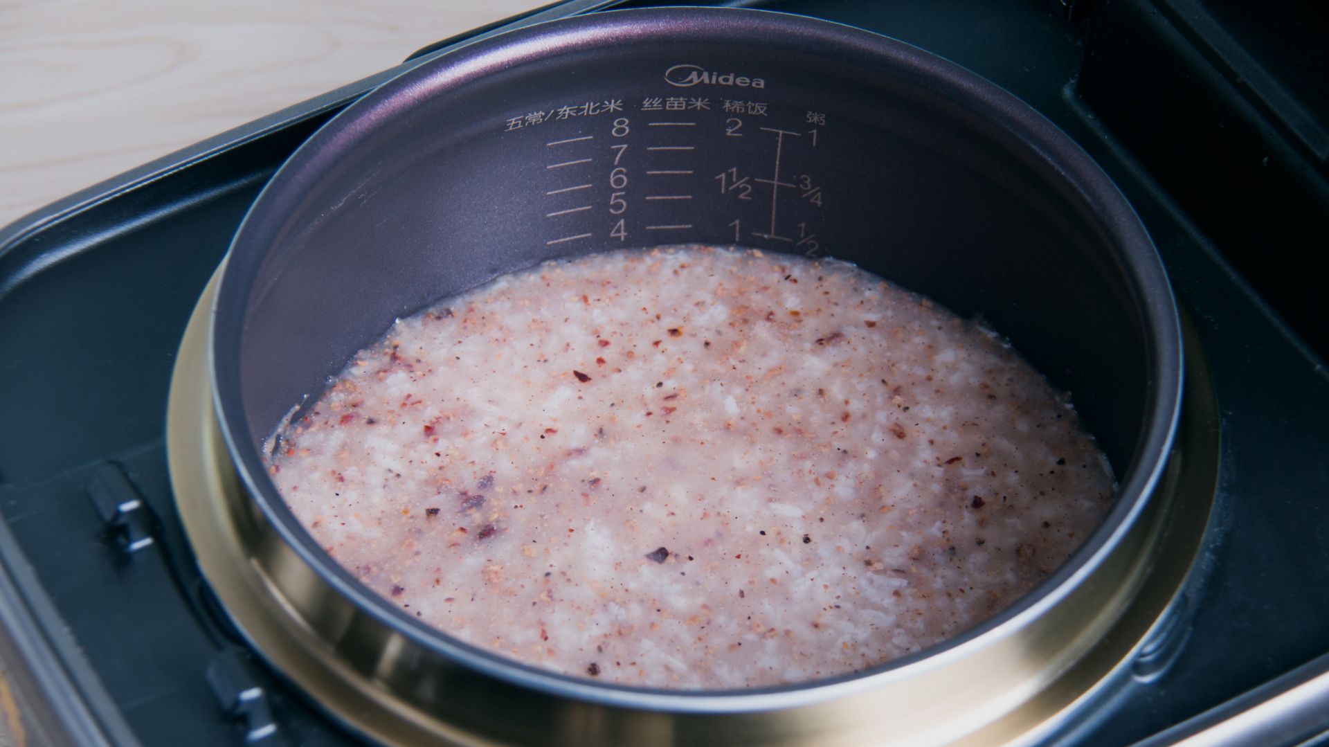 待饭煲烹饪1小时后加入压碎的山核桃仁搅匀,合盖继续煮食。
