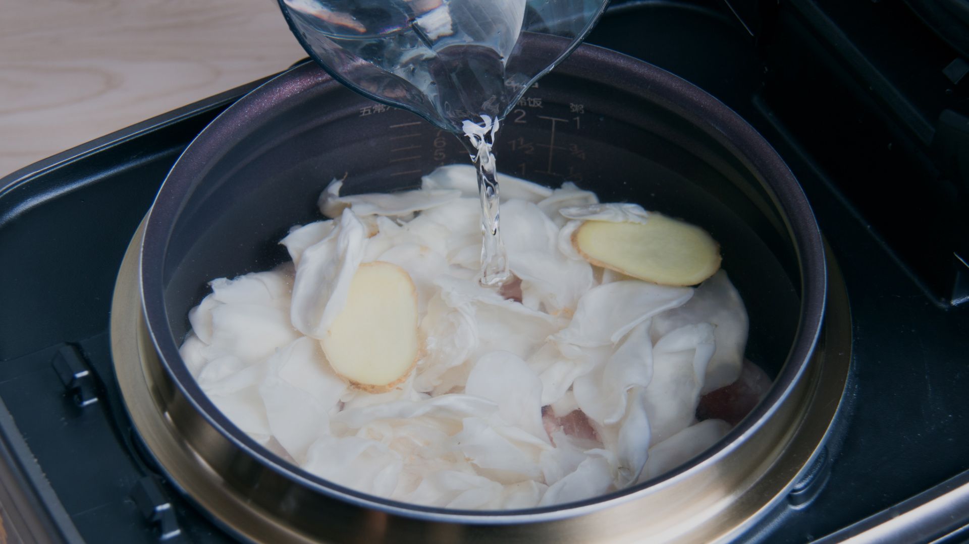 将所有食材一起放入内锅,注入清水至煮稀饭2刻度水位,合盖开始烹饪。大火煮开3分钟左右转小火煲大概2小时