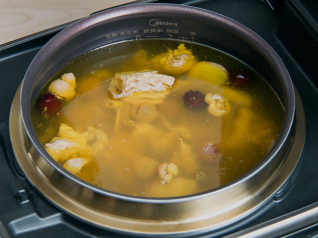 准备好所有材料,红枣、桂圆肉用清水冲洗干净;姜洗净切片;将鸡洗净,剁成块;放适量老酒焯去血水捞出沥干待用。