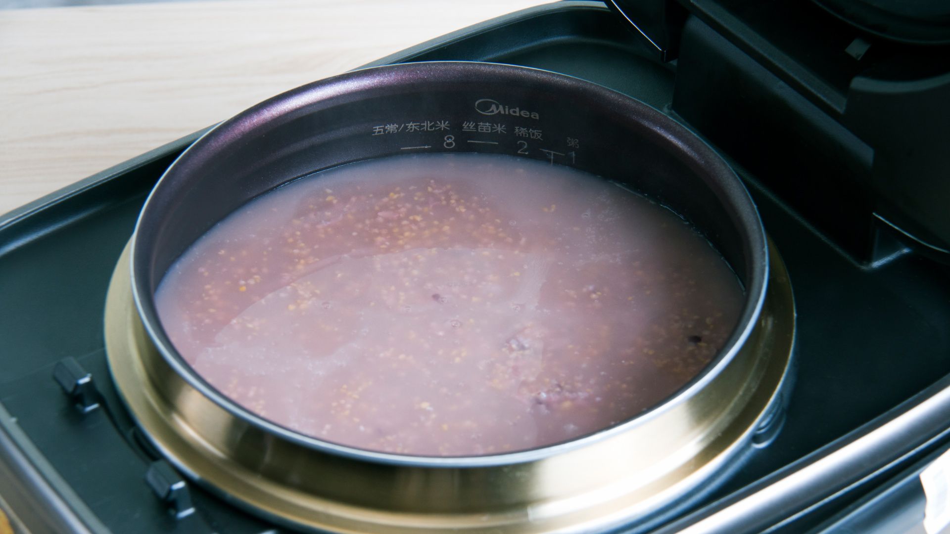 浸泡好后加入大米、糯米、小米一起洗净沥干,倒入内锅