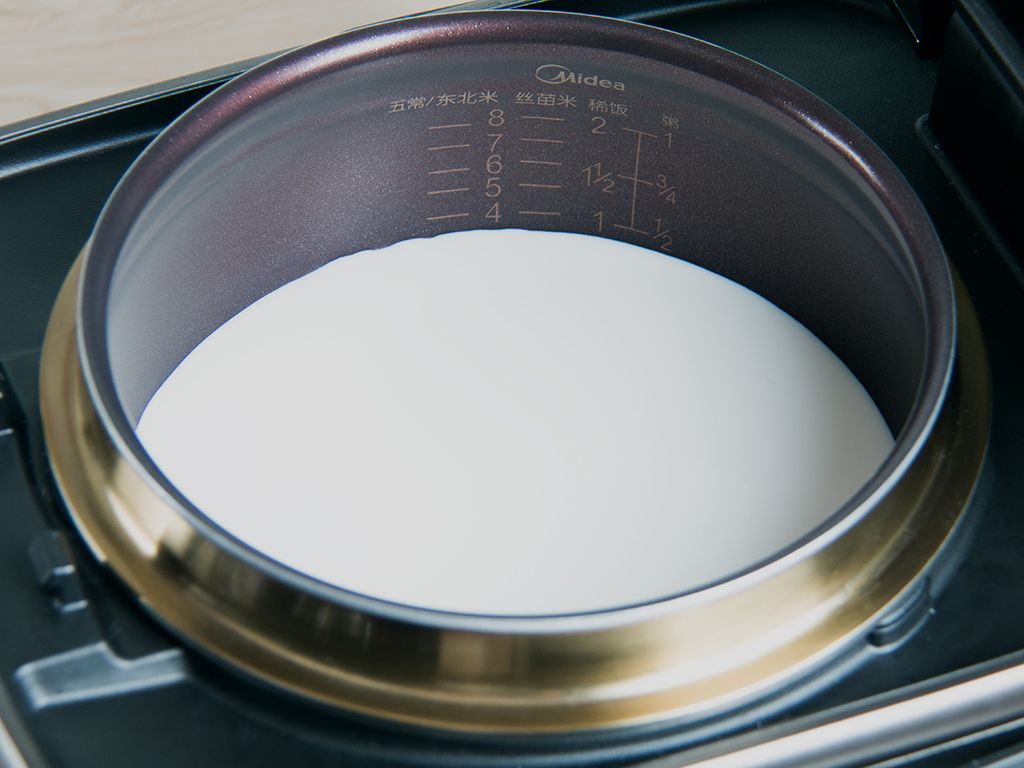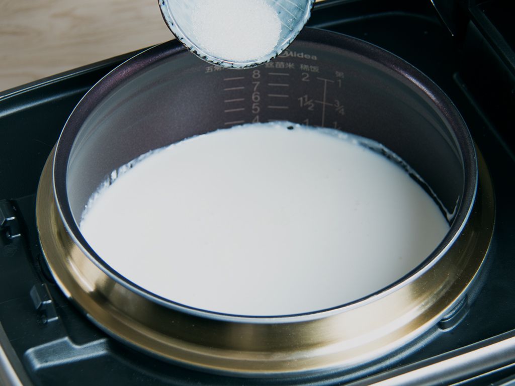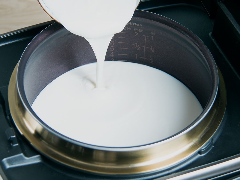 将内胆清洁干净、擦干水份,依次倒入纯牛奶1000毫升和酸奶100毫升搅拌均匀。