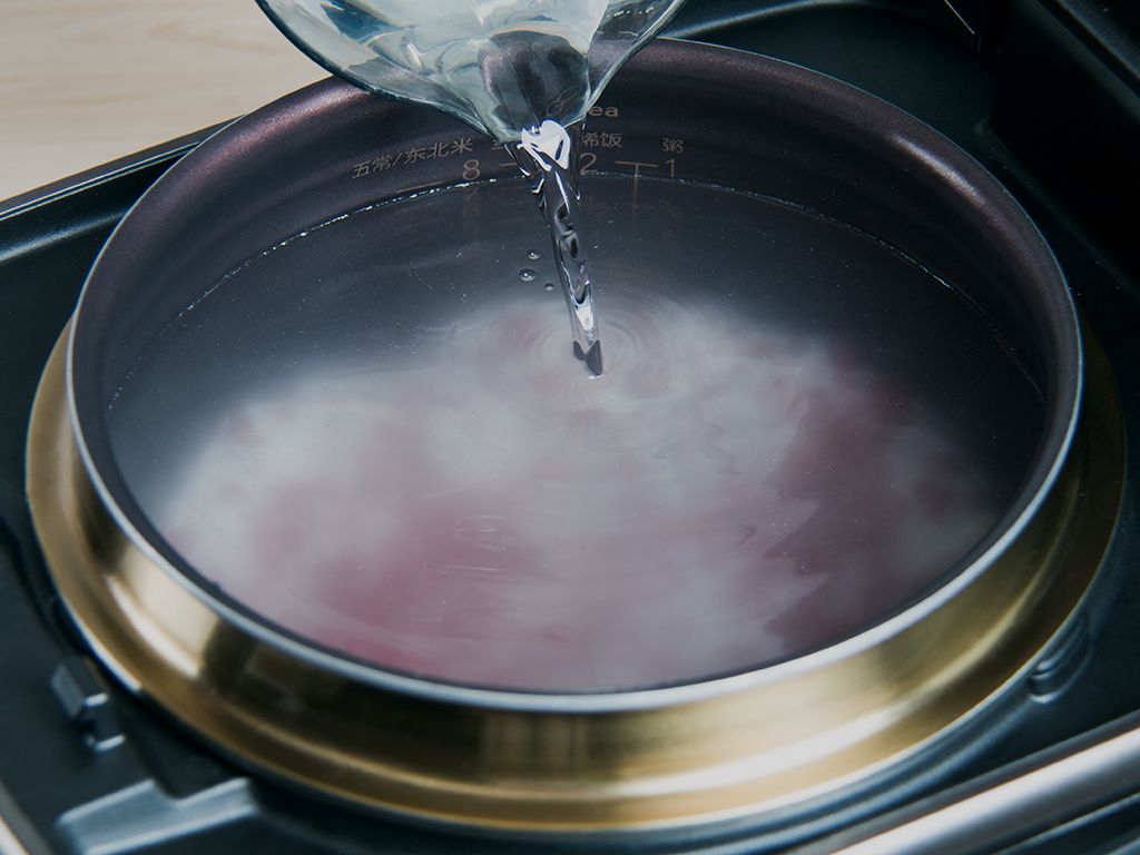 大米洗净沥干,泡好的红豆、冰糖20克一同倒入内锅。