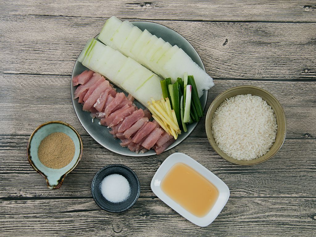 将食材洗净、大米沥干、冬瓜去皮切片、瘦肉、姜切丝、葱切段待用。