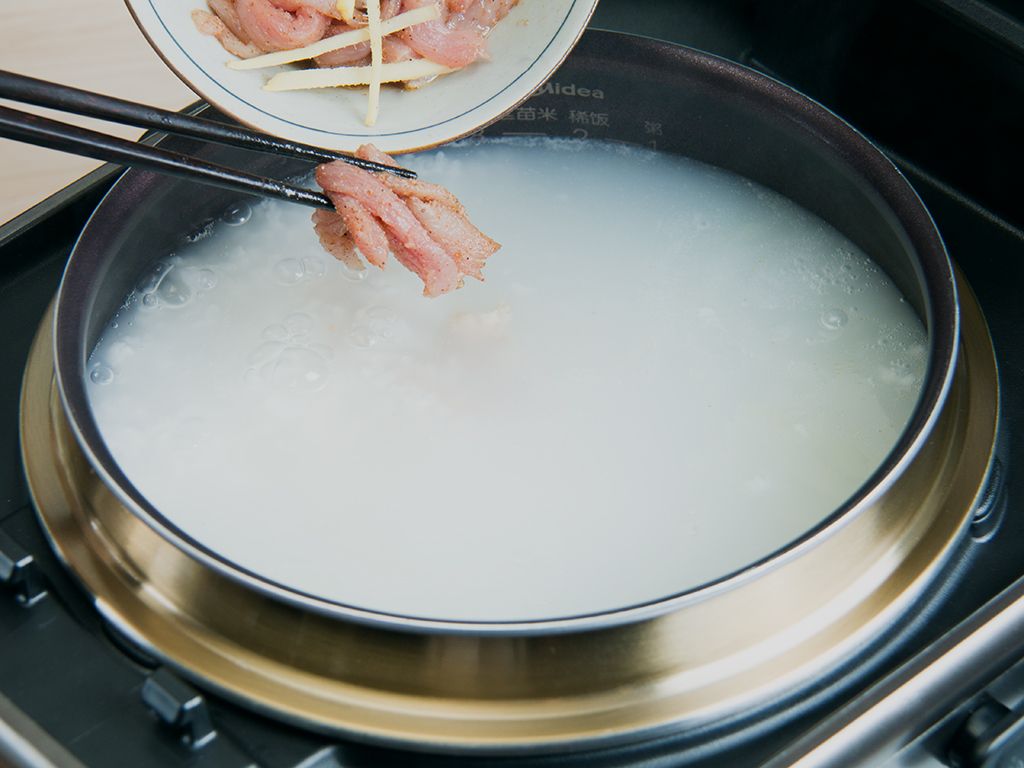 待饭煲烹饪1小时30分钟后倒入腌好的瘦肉搅匀,合盖继续烹饪