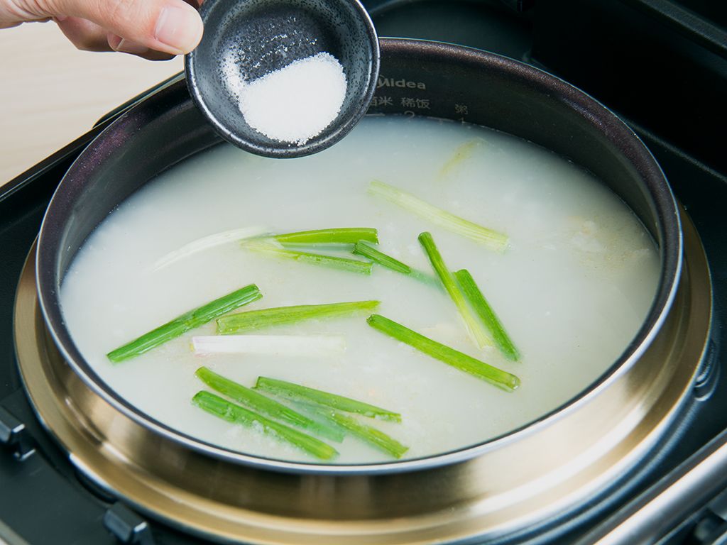 烹饪结束后加入盐5克、葱段20克搅匀盛入碗中即可食用。