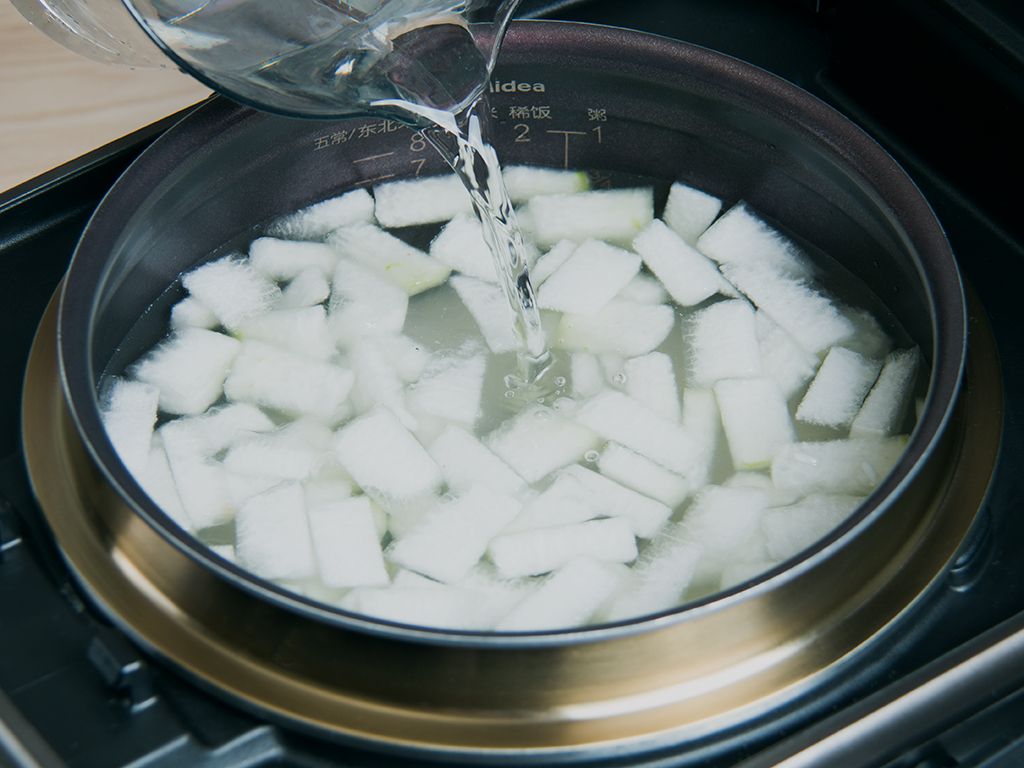 把冬瓜200克、大米75克一同倒入内锅,加水约1000毫升,最多不超过粥0.5刻度水位,合盖开始烹饪。(步骤中图片仅供参考)