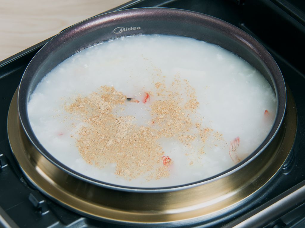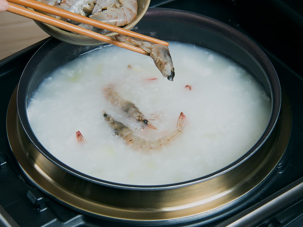待饭煲煮粥至1小时30分后开盖倒入大虾。