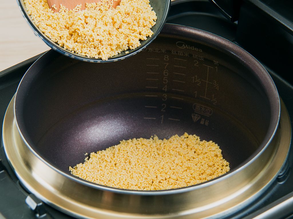 将小米150克反复淘洗干净沥干。(可按人数增减重量)。