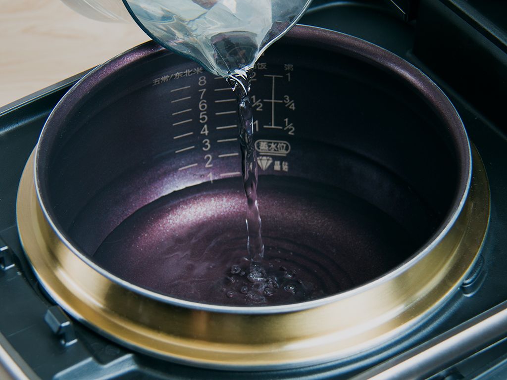 饭煲内锅加入清水至煮饭1刻度水位(约370毫升)。
